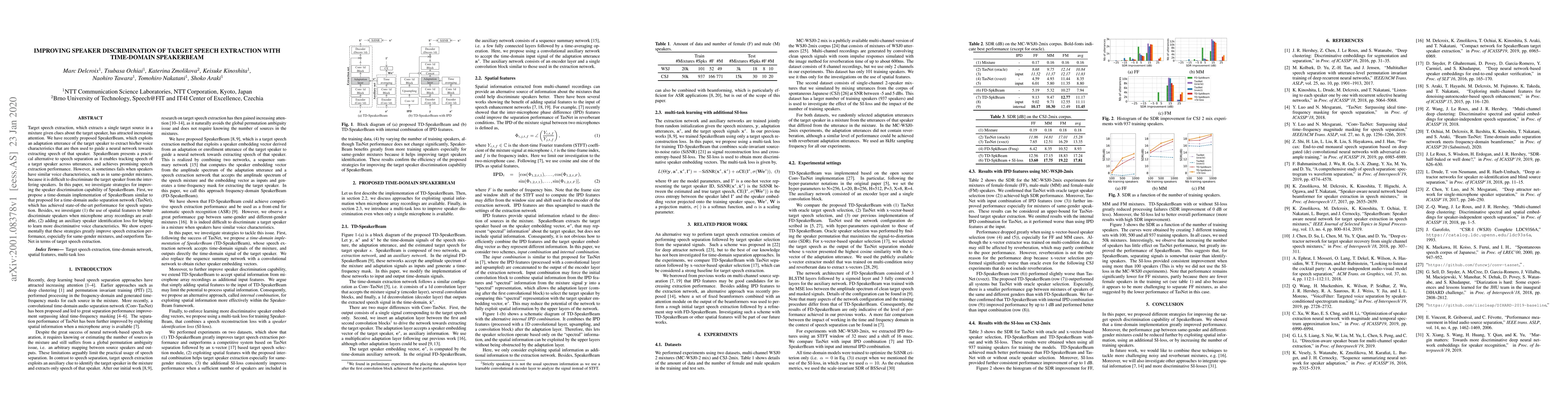 This paper proposes enhancements to SpeakerBeam for better target speech extraction, particularly in same-gender mixtures. It introduces a time-domain implementation and explores spatial features and an auxiliary speaker identification loss, achieving superior performance compared to TasNet.