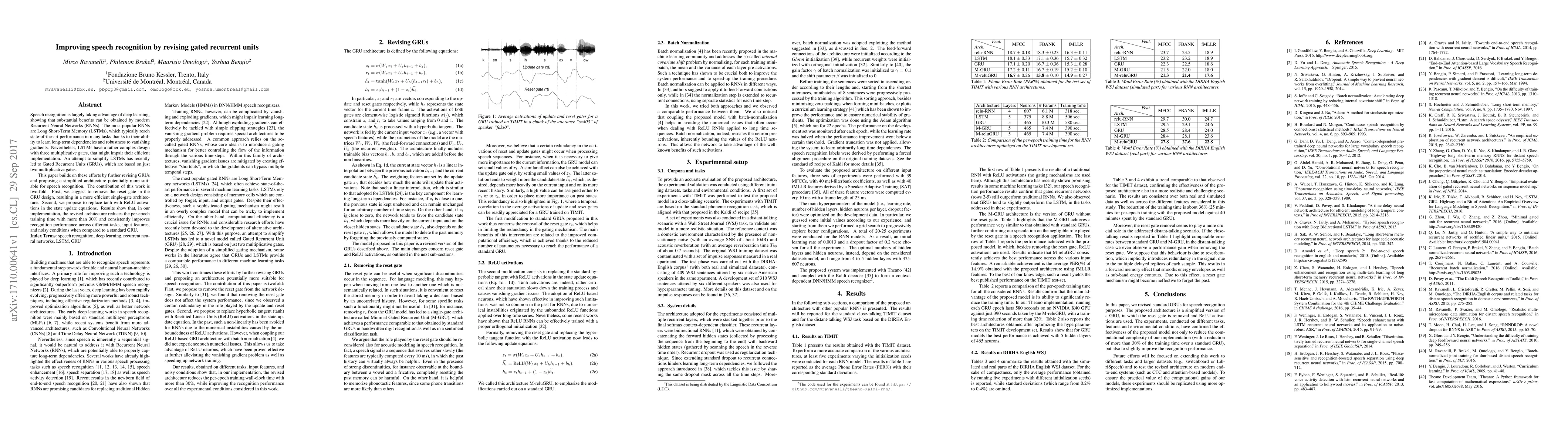 This paper proposes a revised version of Gated Recurrent Units (GRUs) to enhance speech recognition performance. The authors suggest eliminating the reset gate and using ReLU activations, resulting in a more efficient single-gate architecture that reduces training time by over 30% and improves recognition performance across various tasks and conditions.