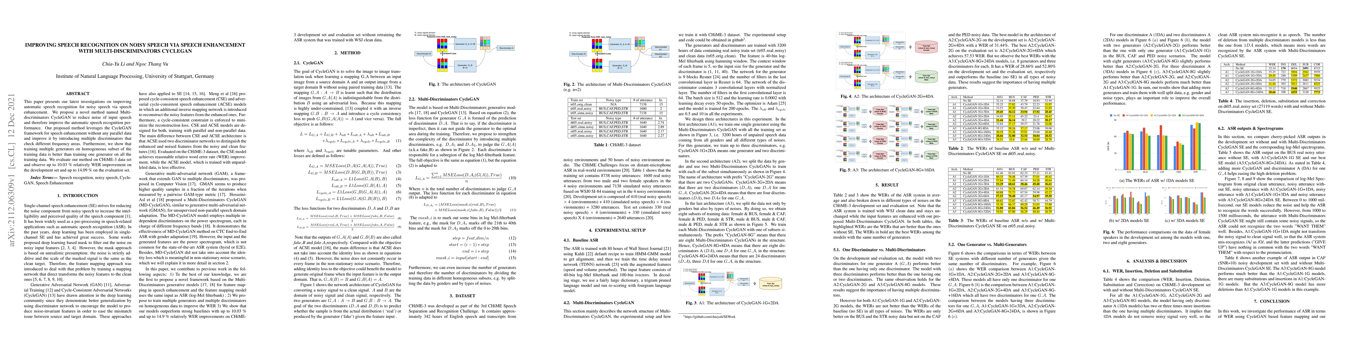 This paper presents our latest investigations on improving automatic speech recognition for noisy speech via speech enhancement. We propose a novel method named Multi-discriminators CycleGAN to reduce noise of input speech and therefore improve the automatic speech recognition performance. Our proposed method leverages the CycleGAN framework for speech enhancement without any parallel data and improve it by introducing multiple discriminators that check different frequency areas. Furthermore, we show that training multiple generators on homogeneous subset of the training data is better than training one generator on all the training data. We evaluate our method on CHiME-3 data set and observe up to 10.03% relatively WER improvement on the development set and up to 14.09% on the evaluation set.