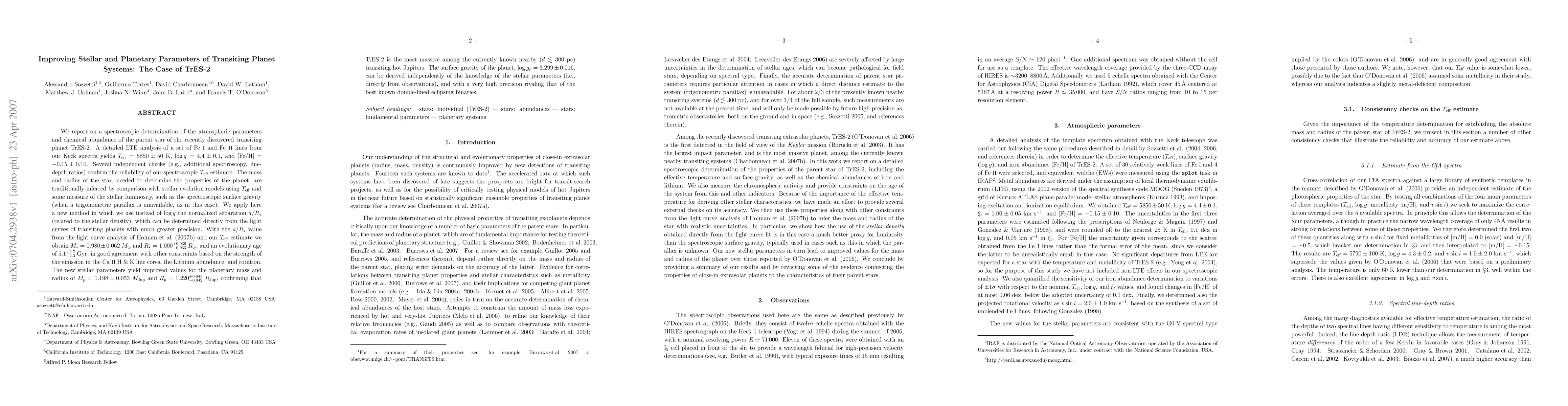 We report on a spectroscopic determination of the atmospheric parameters and chemical abundance of the parent star of the recently discovered transiting planet {TrES-2}. A detailed LTE analysis of a set of \ion{Fe}{1} and \ion{Fe}{2} lines from our Keck spectra yields $T_\mathrm{eff} = 5850\pm 50$ K, $\log g = 4.4\pm 0.1$, and [Fe/H] $= -0.15\pm 0.10$. Several independent checks (e.g., additional spectroscopy, line-depth ratios) confirm the reliability of our spectroscopic $T_\mathrm{eff}$ estimate. The mass and radius of the star, needed to determine the properties of the planet, are traditionally inferred by comparison with stellar evolution models using $T_\mathrm{eff}$ and some measure of the stellar luminosity, such as the spectroscopic surface gravity (when a trigonometric parallax is unavailable, as in this case). We apply here a new method in which we use instead of $\log g$ the normalized separation $a/R_\star$ (related to the stellar density), which can be determined directly from the light curves of transiting planets with much greater precision. With the $a/R_\star$ value from the light curve analysis of Holman et al. \citeyearpar{holman07b} and our $T_\mathrm{eff}$ estimate we obtain $M_\star = 0.980\pm0.062 M_\odot$ and $R_\star = 1.000_{-0.033}^{+0.036} R_\odot$, and an evolutionary age of $5.1^{+2.7}_{-2.3}$ Gyr, in good agreement with other constraints based on the strength of the emission in the \ion{Ca}{2} H & K line cores, the Lithium abundance, and rotation. The new stellar parameters yield improved values for the planetary mass and radius of $M_p = 1.198 \pm 0.053 M_\mathrm{Jup}$ and $R_p = 1.220^{+0.045}_{-0.042} R_\mathrm{Jup}$, confirming that {TrES-2} is the most massive among the currently known nearby ($d\lesssim 300$ pc) transiting hot Jupiters. [Abridged]