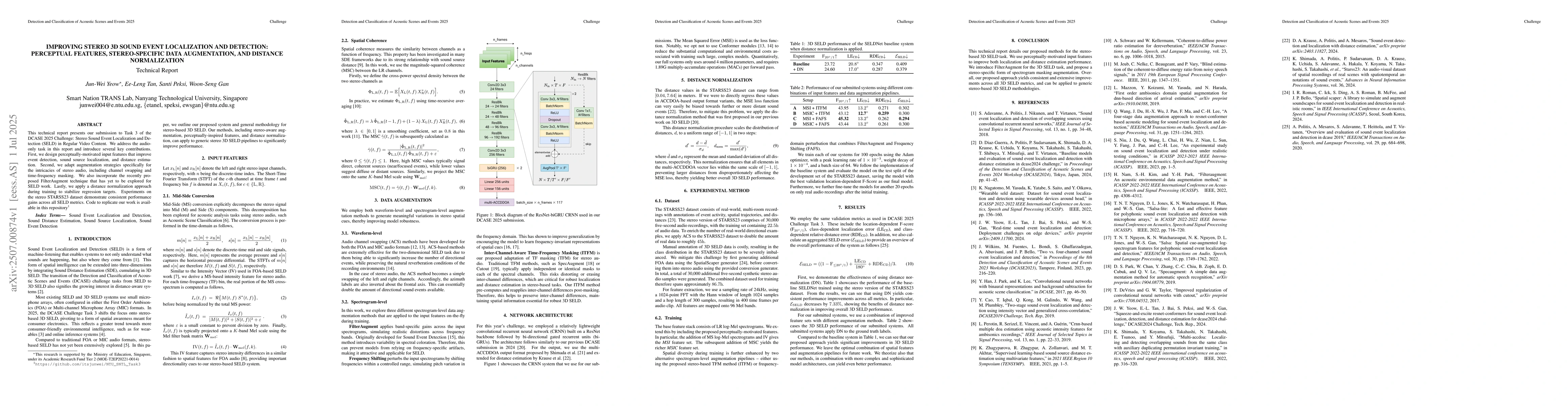 This technical report presents our submission to Task 3 of the DCASE 2025 Challenge: Stereo Sound Event Localization and Detection (SELD) in Regular Video Content. We address the audio-only task in this report and introduce several key contributions. First, we design perceptually-motivated input features that improve event detection, sound source localization, and distance estimation. Second, we adapt augmentation strategies specifically for the intricacies of stereo audio, including channel swapping and time-frequency masking. We also incorporate the recently proposed FilterAugment technique that has yet to be explored for SELD work. Lastly, we apply a distance normalization approach during training to stabilize regression targets. Experiments on the stereo STARSS23 dataset demonstrate consistent performance gains across all SELD metrics. Code to replicate our work is available in this repository: https://github.com/itsjunwei/NTU_SNTL_Task3