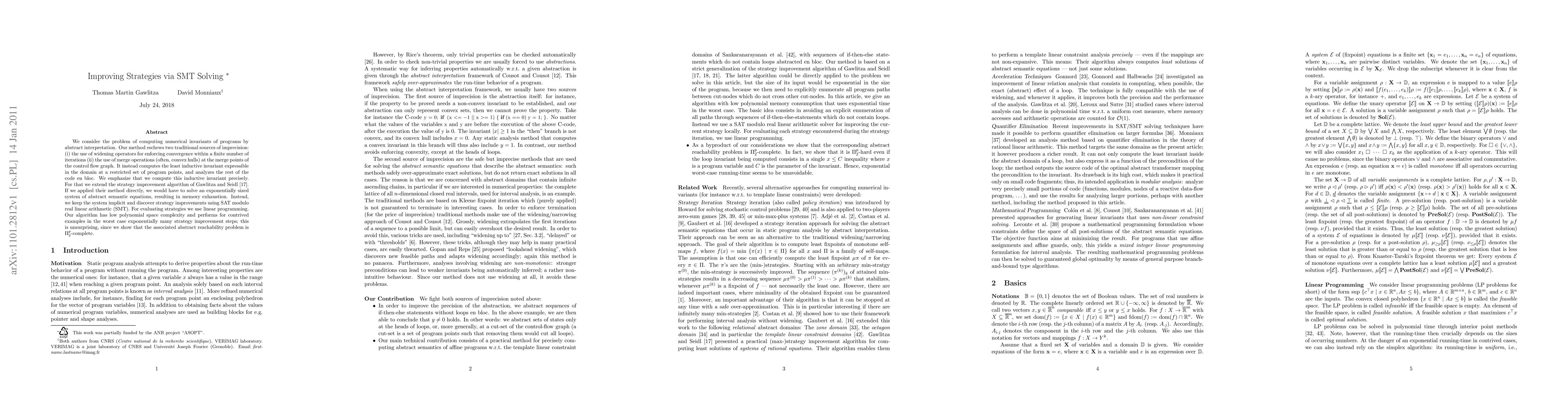 We consider the problem of computing numerical invariants of programs by abstract interpretation. Our method eschews two traditional sources of imprecision: (i) the use of widening operators for enforcing convergence within a finite number of iterations (ii) the use of merge operations (often, convex hulls) at the merge points of the control flow graph. It instead computes the least inductive invariant expressible in the domain at a restricted set of program points, and analyzes the rest of the code en bloc. We emphasize that we compute this inductive invariant precisely. For that we extend the strategy improvement algorithm of [Gawlitza and Seidl, 2007]. If we applied their method directly, we would have to solve an exponentially sized system of abstract semantic equations, resulting in memory exhaustion. Instead, we keep the system implicit and discover strategy improvements using SAT modulo real linear arithmetic (SMT). For evaluating strategies we use linear programming. Our algorithm has low polynomial space complexity and performs for contrived examples in the worst case exponentially many strategy improvement steps; this is unsurprising, since we show that the associated abstract reachability problem is Pi-p-2-complete.