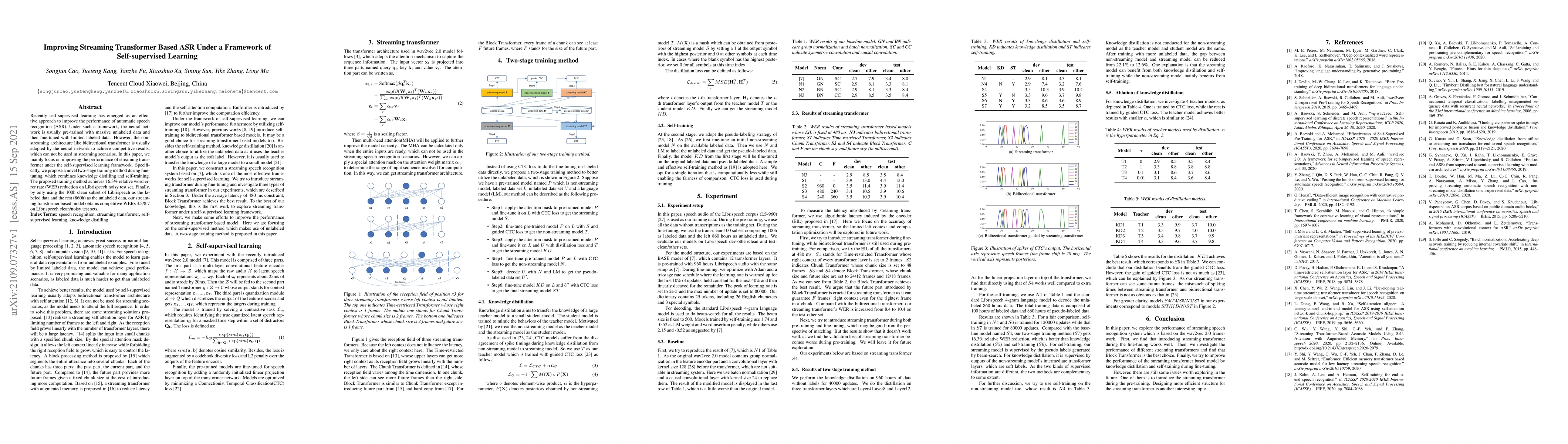 Recently self-supervised learning has emerged as an effective approach to improve the performance of automatic speech recognition (ASR). Under such a framework, the neural network is usually pre-trained with massive unlabeled data and then fine-tuned with limited labeled data. However, the non-streaming architecture like bidirectional transformer is usually adopted by the neural network to achieve competitive results, which can not be used in streaming scenarios. In this paper, we mainly focus on improving the performance of streaming transformer under the self-supervised learning framework. Specifically, we propose a novel two-stage training method during fine-tuning, which combines knowledge distilling and self-training. The proposed training method achieves 16.3% relative word error rate (WER) reduction on Librispeech noisy test set. Finally, by only using the 100h clean subset of Librispeech as the labeled data and the rest (860h) as the unlabeled data, our streaming transformer based model obtains competitive WERs 3.5/8.7 on Librispeech clean/noisy test sets.