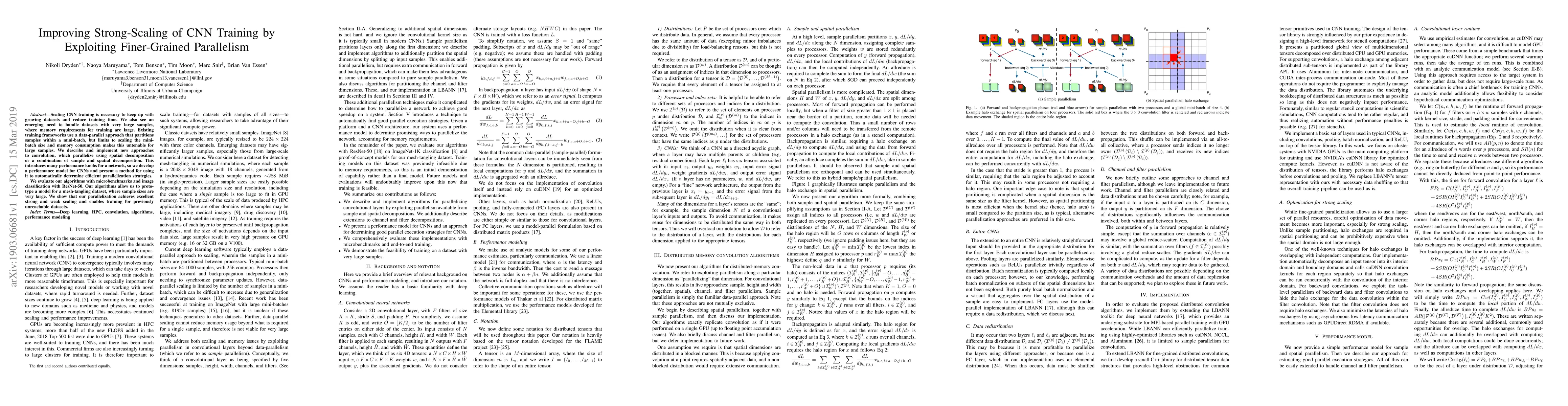 Scaling CNN training is necessary to keep up with growing datasets and reduce training time. We also see an emerging need to handle datasets with very large samples, where memory requirements for training are large. Existing training frameworks use a data-parallel approach that partitions samples within a mini-batch, but limits to scaling the mini-batch size and memory consumption makes this untenable for large samples. We describe and implement new approaches to convolution, which parallelize using spatial decomposition or a combination of sample and spatial decomposition. This introduces many performance knobs for a network, so we develop a performance model for CNNs and present a method for using it to automatically determine efficient parallelization strategies. We evaluate our algorithms with microbenchmarks and image classification with ResNet-50. Our algorithms allow us to prototype a model for a mesh-tangling dataset, where sample sizes are very large. We show that our parallelization achieves excellent strong and weak scaling and enables training for previously unreachable datasets.