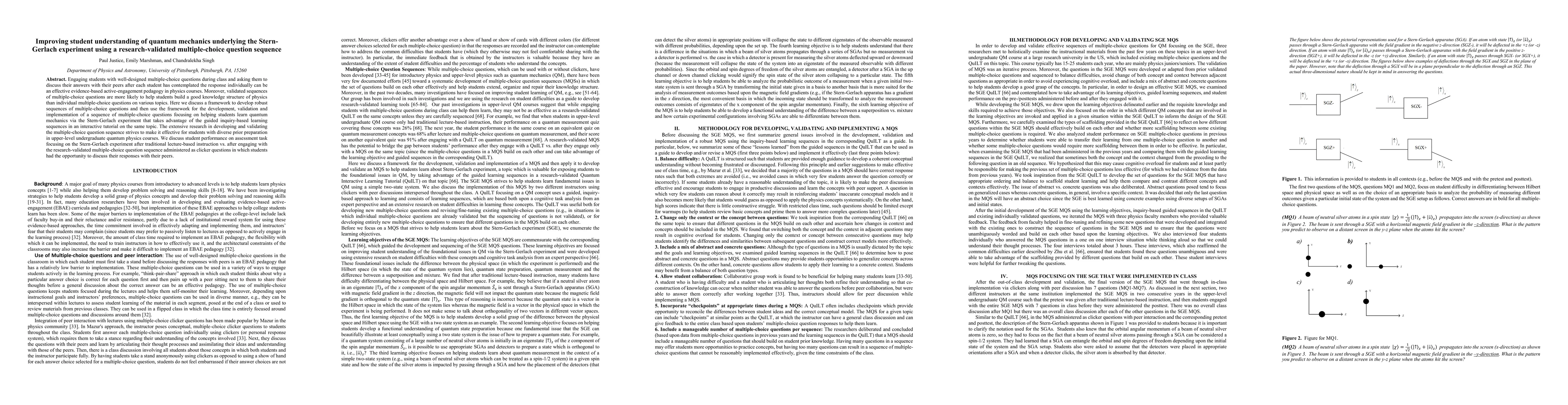 This study develops and validates a sequence of research-validated multiple-choice questions to enhance student understanding of quantum mechanics through the Stern-Gerlach experiment, employing guided inquiry and peer discussion. Results show improved student performance when using this sequence compared to traditional lecture-based instruction.