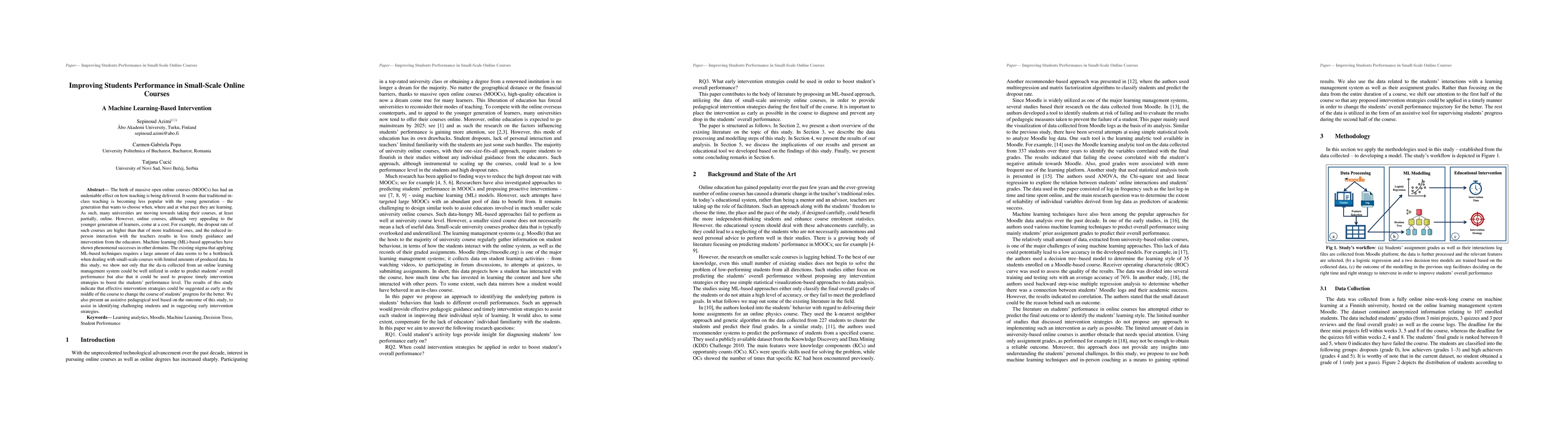 This study explores the use of machine learning to predict student performance and propose timely interventions in small-scale online courses, demonstrating that data from learning management systems can effectively guide early intervention strategies to improve student outcomes. An assistive pedagogical tool is developed to identify at-risk students and suggest timely interventions.