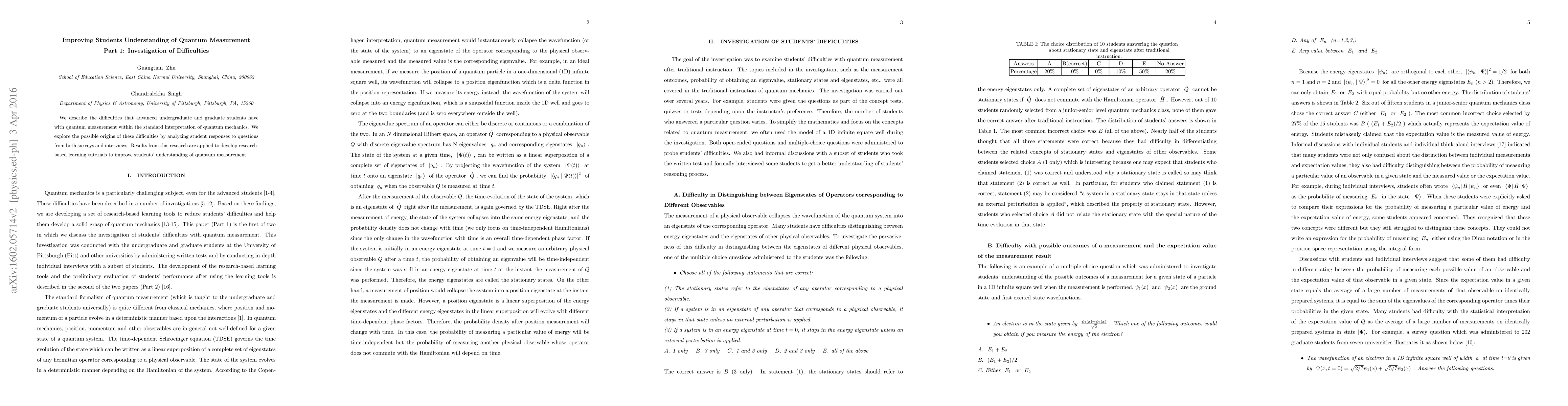 This research investigates the challenges faced by advanced undergraduate and graduate students in understanding quantum measurement, identifying difficulties through surveys and interviews, and using these insights to create targeted learning tutorials.
