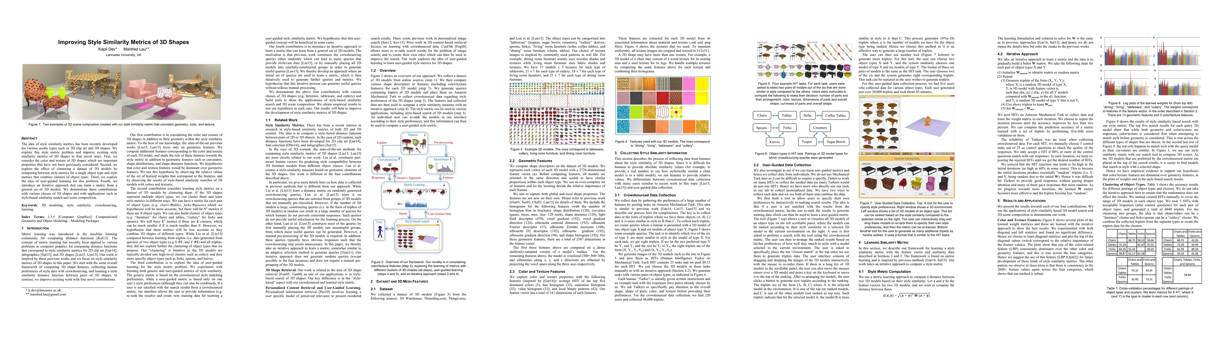 The idea of style similarity metrics has been recently developed for various media types such as 2D clip art and 3D shapes. We explore this style metric problem and improve existing style similarity metrics of 3D shapes in four novel ways. First, we consider the color and texture of 3D shapes which are important properties that have not been previously considered. Second, we explore the effect of clustering a dataset of 3D models by comparing between style metrics for a single object type and style metrics that combine clusters of object types. Third, we explore the idea of user-guided learning for this problem. Fourth, we introduce an iterative approach that can learn a metric from a general set of 3D models. We demonstrate these contributions with various classes of 3D shapes and with applications such as style-based similarity search and scene composition.
