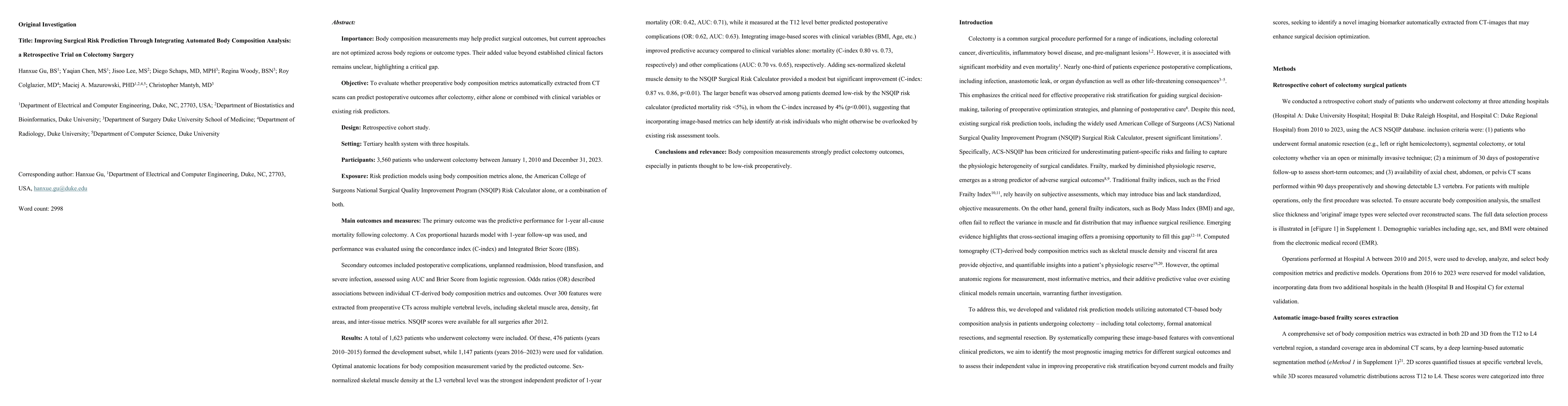 Objective: To evaluate whether preoperative body composition metrics automatically extracted from CT scans can predict postoperative outcomes after colectomy, either alone or combined with clinical variables or existing risk predictors. Main outcomes and measures: The primary outcome was the predictive performance for 1-year all-cause mortality following colectomy. A Cox proportional hazards model with 1-year follow-up was used, and performance was evaluated using the concordance index (C-index) and Integrated Brier Score (IBS). Secondary outcomes included postoperative complications, unplanned readmission, blood transfusion, and severe infection, assessed using AUC and Brier Score from logistic regression. Odds ratios (OR) described associations between individual CT-derived body composition metrics and outcomes. Over 300 features were extracted from preoperative CTs across multiple vertebral levels, including skeletal muscle area, density, fat areas, and inter-tissue metrics. NSQIP scores were available for all surgeries after 2012.