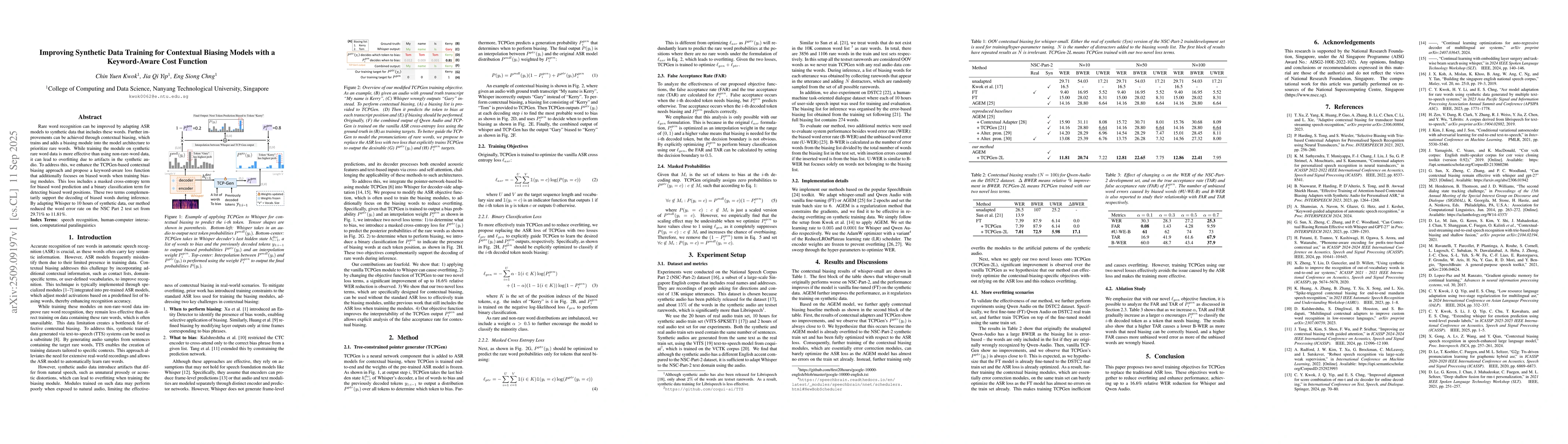 Rare word recognition can be improved by adapting ASR models to synthetic data that includes these words. Further improvements can be achieved through contextual biasing, which trains and adds a biasing module into the model architecture to prioritize rare words. While training the module on synthetic rare word data is more effective than using non-rare-word data, it can lead to overfitting due to artifacts in the synthetic audio. To address this, we enhance the TCPGen-based contextual biasing approach and propose a keyword-aware loss function that additionally focuses on biased words when training biasing modules. This loss includes a masked cross-entropy term for biased word prediction and a binary classification term for detecting biased word positions. These two terms complementarily support the decoding of biased words during inference. By adapting Whisper to 10 hours of synthetic data, our method reduced the word error rate on the NSC Part 2 test set from 29.71% to 11.81%.