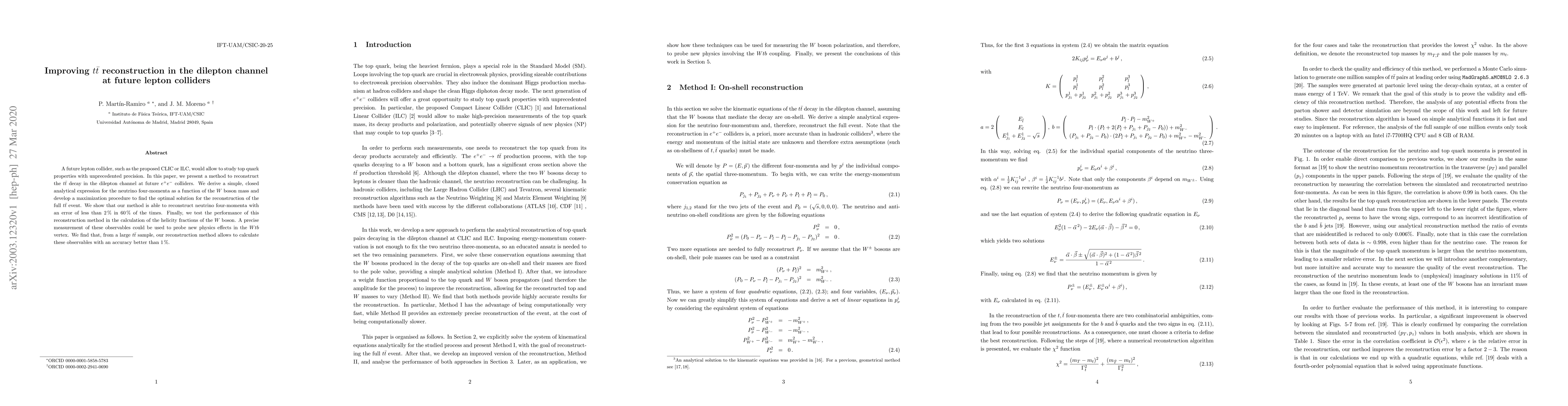 A future lepton collider, such as the proposed CLIC or ILC, would allow to study top quark properties with unprecedented precision. In this paper, we present a method to reconstruct the $t \bar{t}$ decay in the dilepton channel at future $e^+e^-$ colliders. We derive a simple, closed analytical expression for the neutrino four-momenta as a function of the $W$ boson mass and develop a maximization procedure to find the optimal solution for the reconstruction of the full $t \bar{t}$ event. We show that our method is able to reconstruct neutrino four-momenta with an error of less than $2 \, \%$ in $60 \, \%$ of the times. Finally, we test the performance of this reconstruction method in the calculation of the helicity fractions of the $W$ boson. A precise measurement of these observables could be used to probe new physics effects in the $Wtb$ vertex. We find that, from a large $t \bar{t}$ sample, our reconstruction method allows to calculate these observables with an accuracy better than $1 \, \%$.