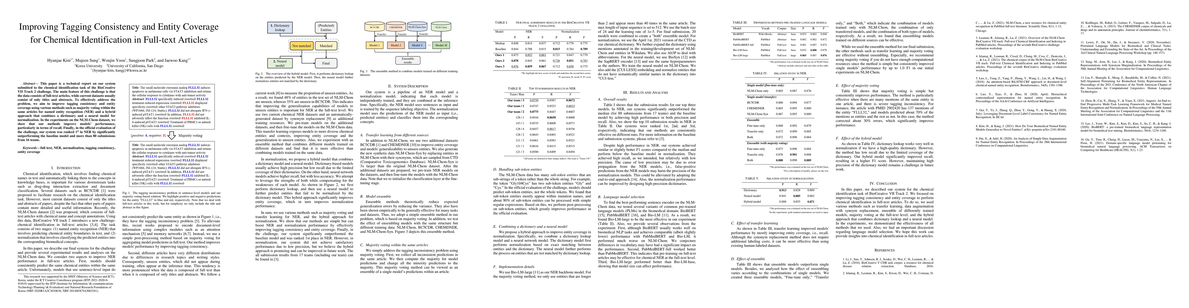 This paper is a technical report on our system submitted to the chemical identification task of the BioCreative VII Track 2 challenge. The main feature of this challenge is that the data consists of full-text articles, while current datasets usually consist of only titles and abstracts. To effectively address the problem, we aim to improve tagging consistency and entity coverage using various methods such as majority voting within the same articles for named entity recognition (NER) and a hybrid approach that combines a dictionary and a neural model for normalization. In the experiments on the NLM-Chem dataset, we show that our methods improve models' performance, particularly in terms of recall. Finally, in the official evaluation of the challenge, our system was ranked 1st in NER by significantly outperforming the baseline model and more than 80 submissions from 16 teams.