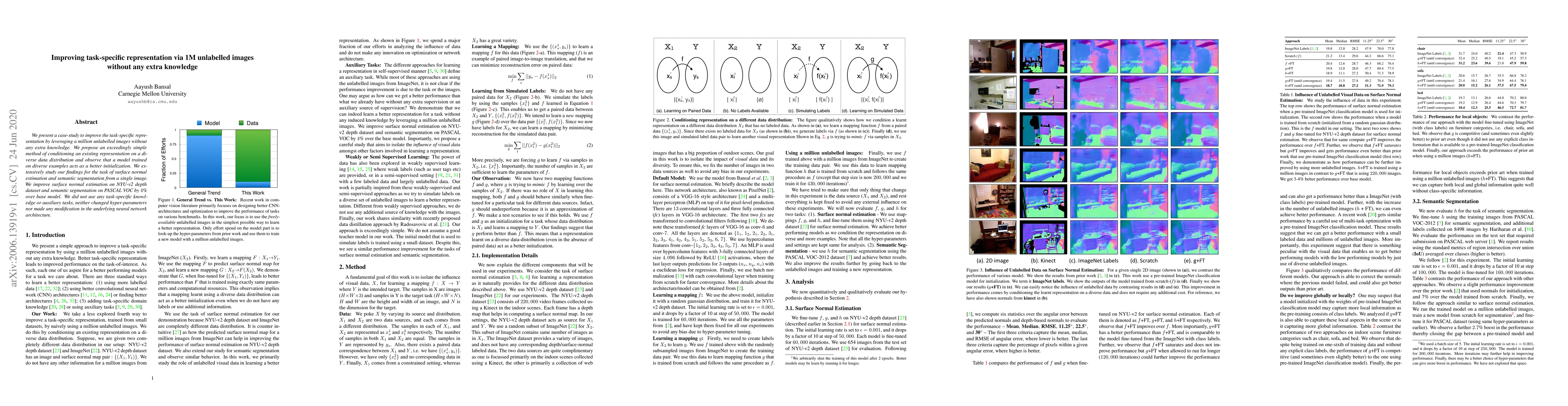 Using 1M unlabelled images improves task-specific representation without extra knowledge, boosting performance in surface normal estimation and semantic segmentation tasks.