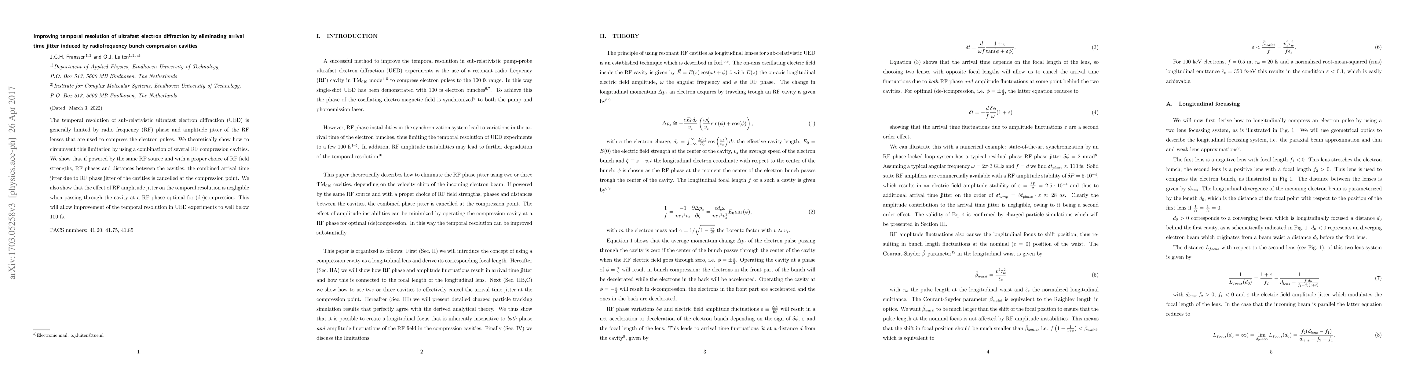 The temporal resolution of sub-relativistic ultrafast electron diffraction (UED) is generally limited by radio frequency (RF) phase and amplitude jitter of the RF lenses that are used to compress the electron pulses. We theoretically show how to circumvent this limitation by using a combination of several RF compression cavities. We show that if powered by the same RF source and with a proper choice of RF field strengths, RF phases and distances between the cavities, the combined arrival time jitter due to RF phase jitter of the cavities is cancelled at the compression point. We also show that the effect of RF amplitude jitter on the temporal resolution is negligible when passing through the cavity at a RF phase optimal for (de)compression. This will allow improvement of the temporal resolution in UED experiments to well below 100 fs.
