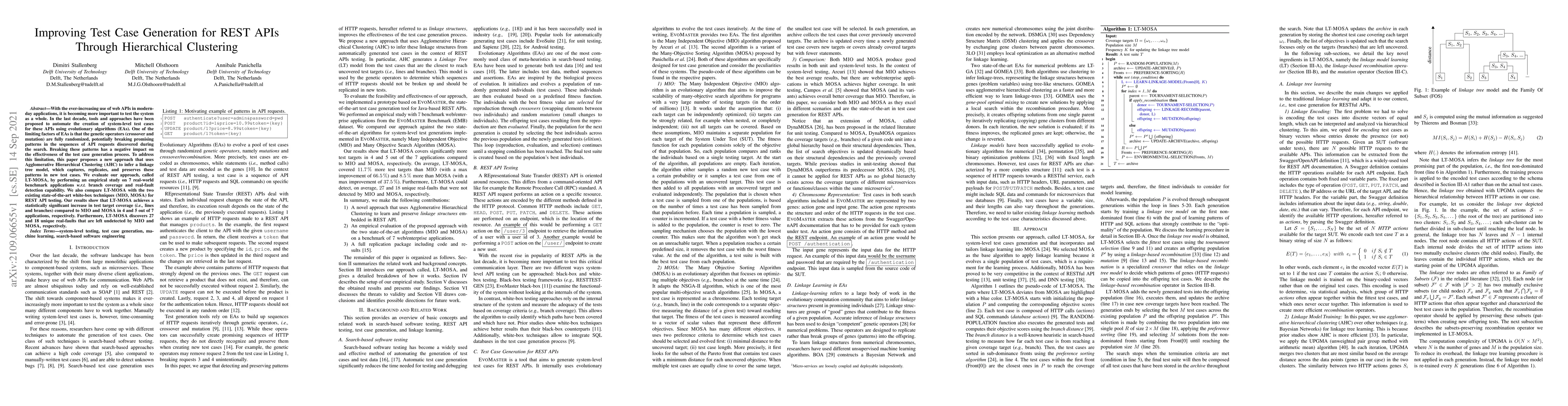 This paper proposes LT-MOSA, a novel approach using hierarchical clustering to improve test case generation for REST APIs, addressing the limitations of evolutionary algorithms by preserving discovered patterns. Empirical results show LT-MOSA significantly outperforms existing techniques in coverage and fault detection.