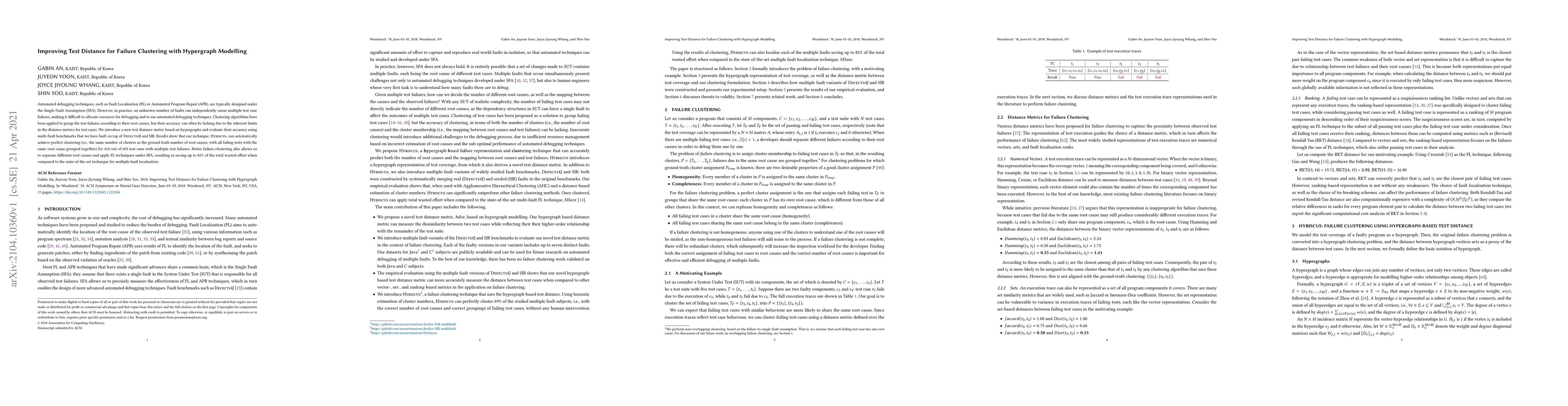 A new method, Hybiscus, improves test distance for failure clustering using hypergraph modelling, achieving perfect clustering in 418 out of 605 test runs and saving up to 82% of wasted effort in multiple fault localisation.