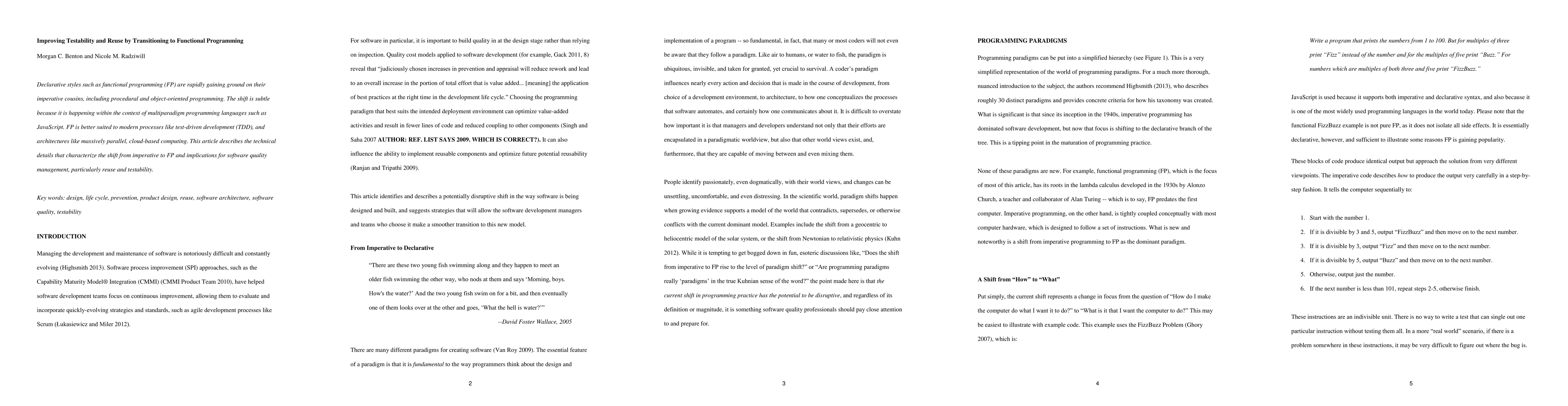 The paper explores how transitioning to functional programming improves software testability and reuse in multi-paradigm languages like JavaScript. It describes the technical details of this shift and its implications for modern software development processes.