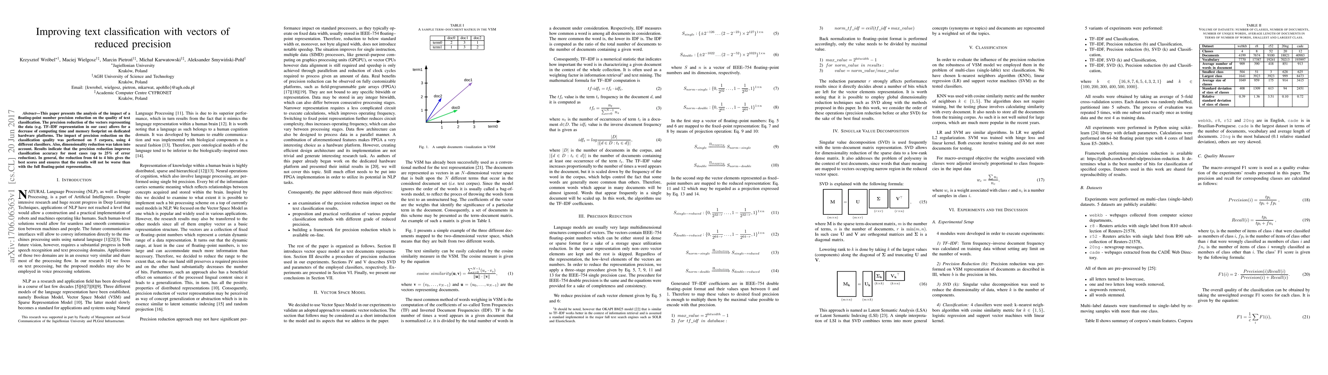 This paper presents the analysis of the impact of a floating-point number precision reduction on the quality of text classification. The precision reduction of the vectors representing the data (e.g. TF-IDF representation in our case) allows for a decrease of computing time and memory footprint on dedicated hardware platforms. The impact of precision reduction on the classification quality was performed on 5 corpora, using 4 different classifiers. Also, dimensionality reduction was taken into account. Results indicate that the precision reduction improves classification accuracy for most cases (up to 25% of error reduction). In general, the reduction from 64 to 4 bits gives the best scores and ensures that the results will not be worse than with the full floating-point representation.