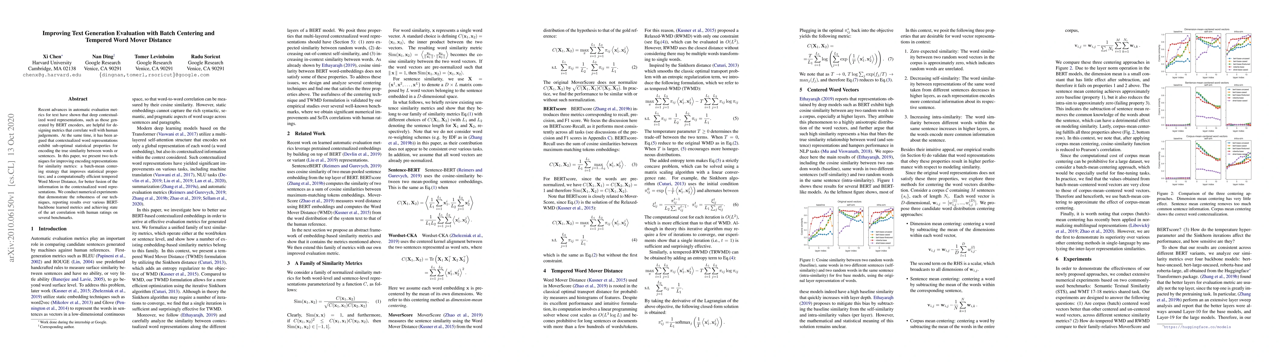 This paper improves text generation evaluation with two techniques: batch-mean centering and tempered Word Mover Distance, enhancing statistical properties and correlation with human judgements.