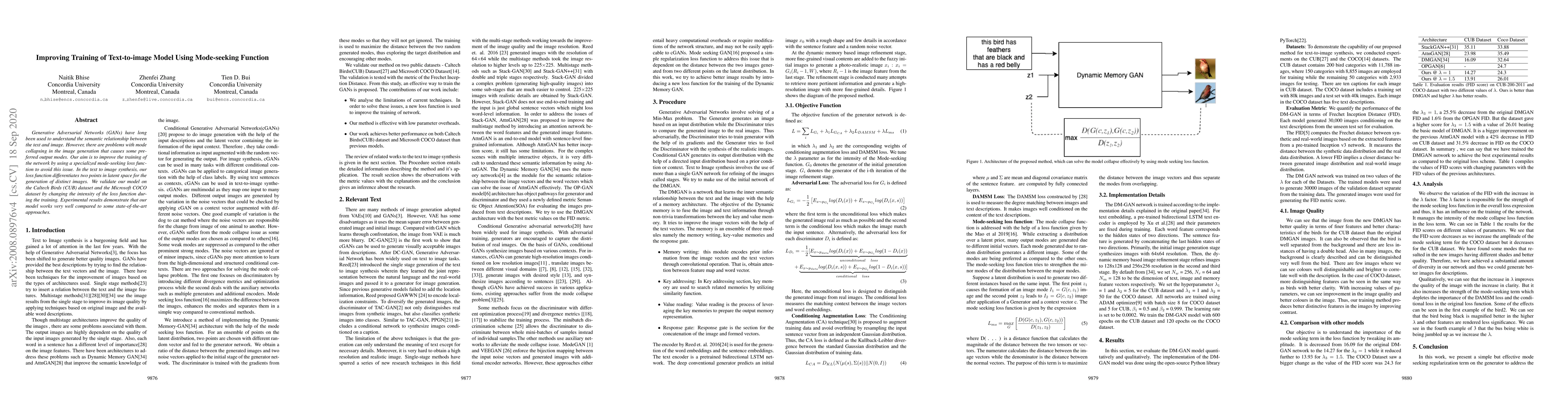 This paper proposes a mode-seeking loss function to enhance GANs for text-to-image generation, addressing mode collapsing issues. The specialized loss function improves distinct image generation by differentiating latent space points, validated on Caltech Birds and Microsoft COCO datasets, showing superior performance over state-of-the-art methods.