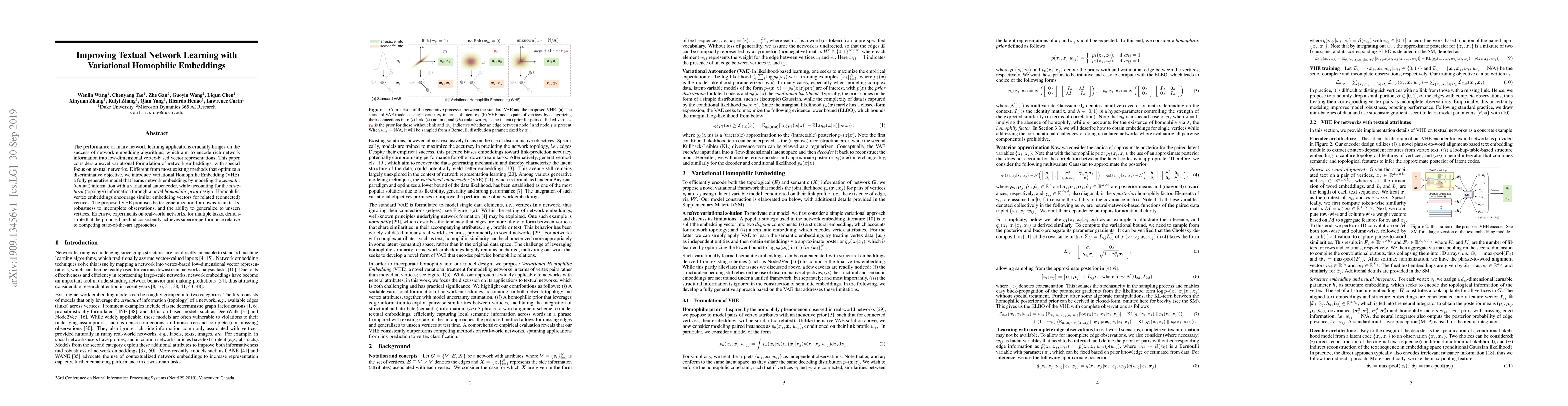 This paper introduces Variational Homophilic Embedding (VHE), a generative model for network embedding that leverages both textual and structural network information. VHE uses a variational autoencoder to model semantic data and a novel homophilic prior to enhance structural information, leading to better generalization and performance on various network learning tasks.