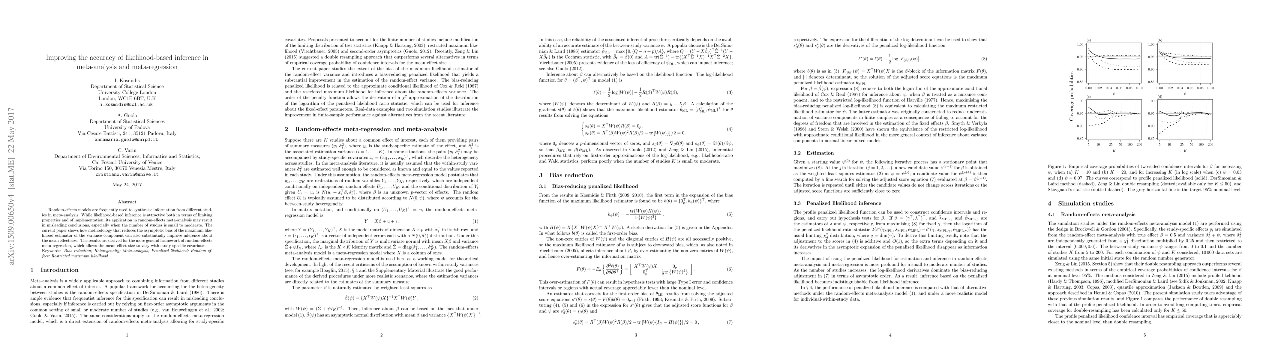 This paper proposes a methodology to enhance the accuracy of likelihood-based inference in random-effects meta-analysis and meta-regression, particularly addressing the issue of asymptotic bias in the maximum likelihood estimator of variance components, thereby improving conclusions about mean effect size. The approach is applicable to scenarios where the number of studies is small to moderate.
