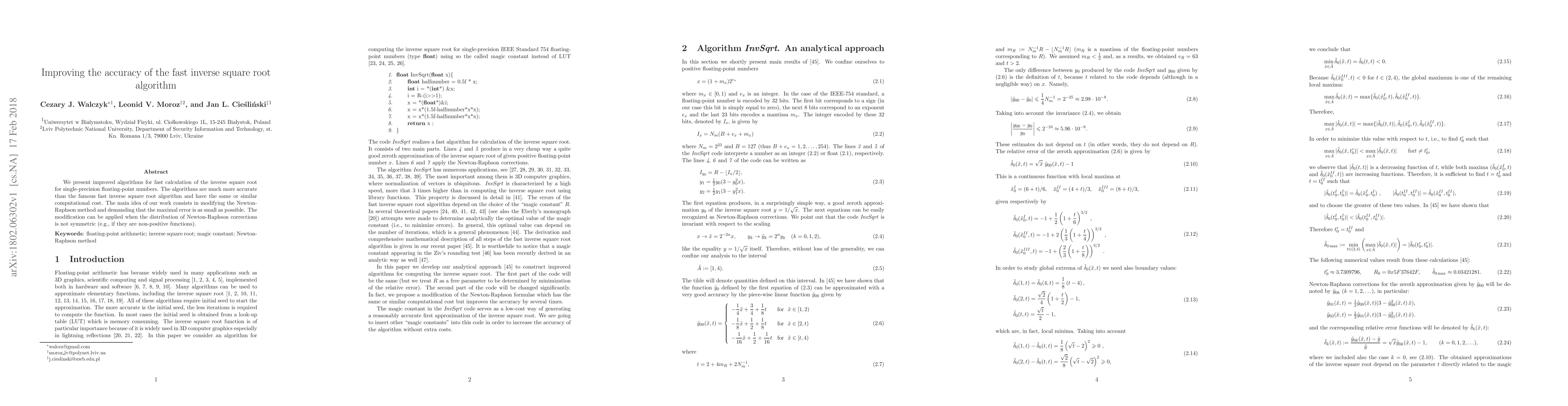 We present improved algorithms for fast calculation of the inverse square root for single-precision floating-point numbers. The algorithms are much more accurate than the famous fast inverse square root algorithm and have the same or similar computational cost. The main idea of our work consists in modifying the Newton-Raphson method and demanding that the maximal error is as small as possible. Such modification is possible when the distribution of Newton-Raphson corrections is not symmetric (e.g., if they are non-positive functions).