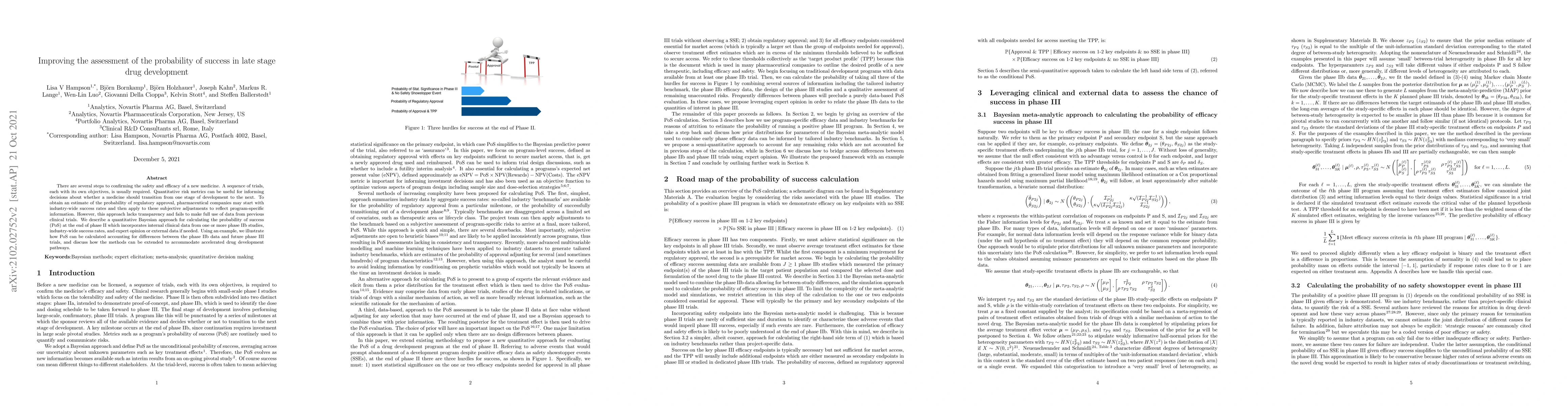 There are several steps to confirming the safety and efficacy of a new medicine. A sequence of trials, each with its own objectives, is usually required. Quantitative risk metrics can be useful for informing decisions about whether a medicine should transition from one stage of development to the next. To obtain an estimate of the probability of regulatory approval, pharmaceutical companies may start with industry-wide success rates and then apply to these subjective adjustments to reflect program-specific information. However, this approach lacks transparency and fails to make full use of data from previous clinical trials. We describe a quantitative Bayesian approach for calculating the probability of success (PoS) at the end of phase II which incorporates internal clinical data from one or more phase IIb studies, industry-wide success rates, and expert opinion or external data if needed. Using an example, we illustrate how PoS can be calculated accounting for differences between the phase IIb data and future phase III trials, and discuss how the methods can be extended to accommodate accelerated drug development pathways.