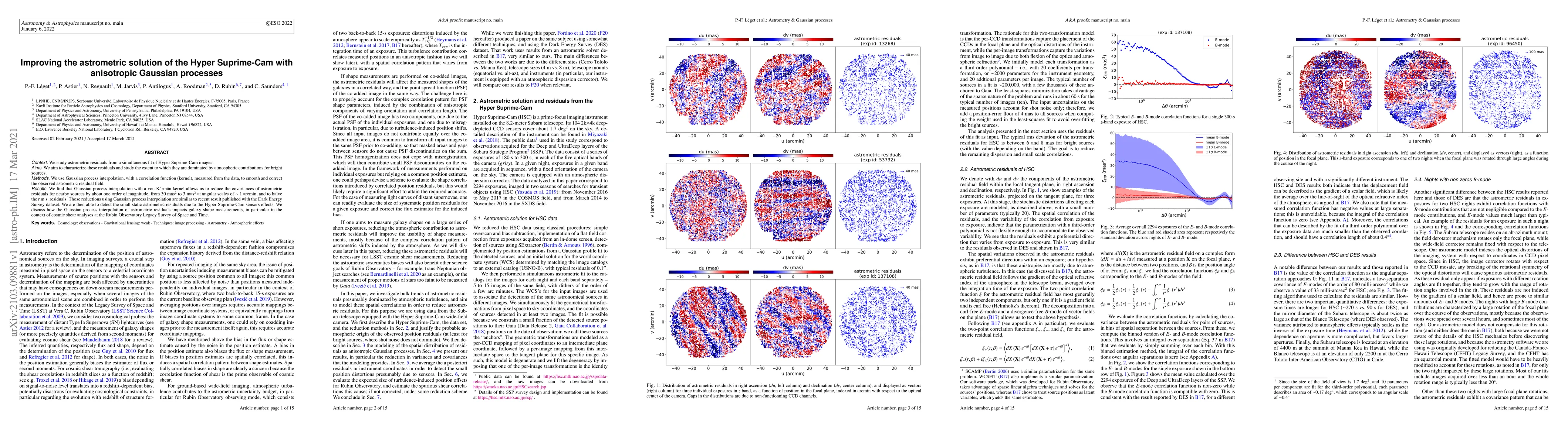 This paper investigates astrometric residuals from Hyper Suprime-Cam images, employing anisotropic Gaussian processes to smooth and correct these residuals. The study finds significant reductions in astrometric residual covariances and r.m.s. residuals, enabling detection of sensor-induced static residuals and implications for galaxy shape measurements in cosmic shear analyses.