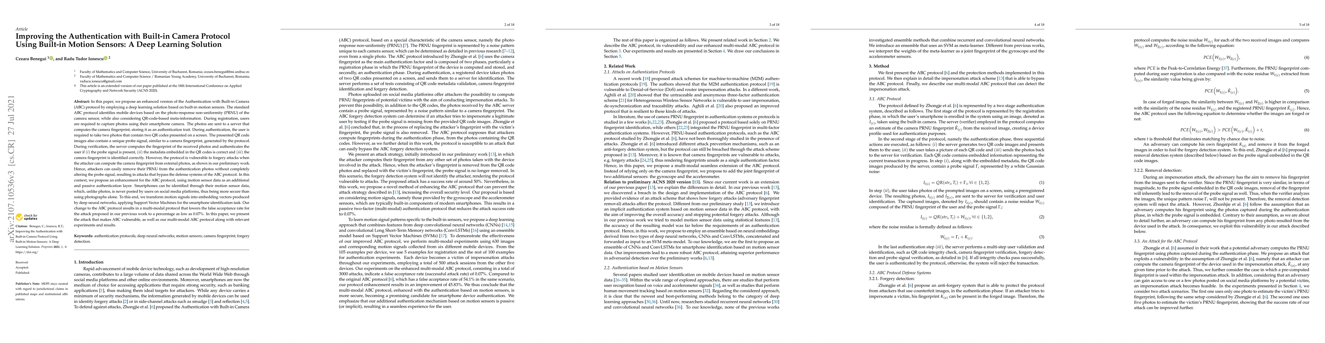 This paper proposes an enhanced Authentication with Built-in Camera (ABC) protocol using deep learning and built-in motion sensors to improve security against forgery attacks. The new method incorporates motion sensor data, transforming it into vectors for smartphone identification, thus creating a more secure multi-modal authentication system that reduces false acceptance rates significantly.