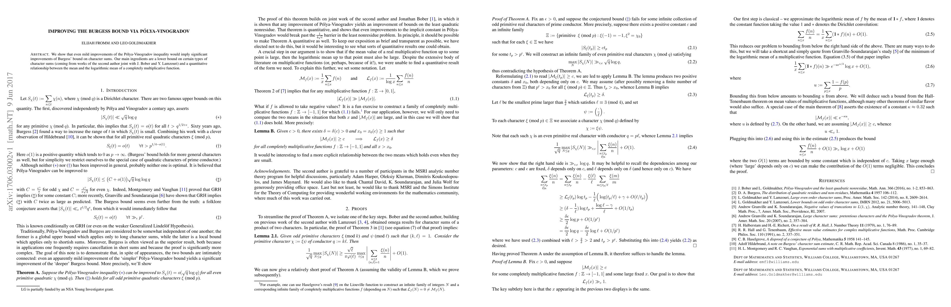 This paper demonstrates that enhancing the Polya-Vinogradov inequality can substantially improve Burgess' bound on character sums, using lower bounds on specific character sums and a quantitative link between the mean and logarithmic mean of completely multiplicative functions as key components.