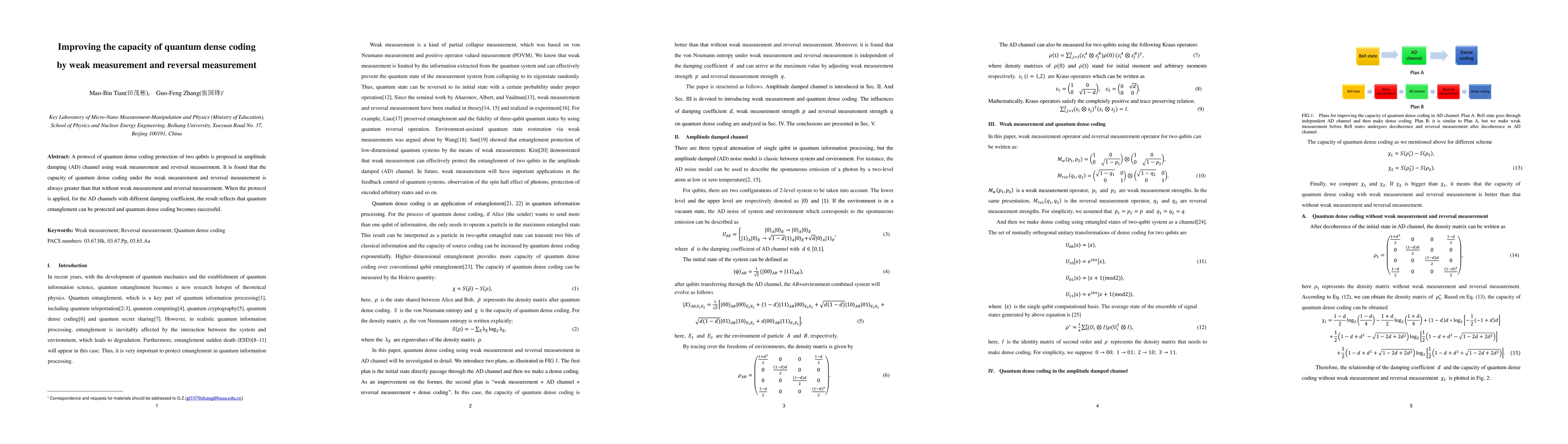 Summary: This paper proposes a protocol for quantum dense coding using weak and reversal measurements to enhance capacity in amplitude damping channels. The results show that this method consistently improves coding efficiency and successfully protects quantum entanglement.