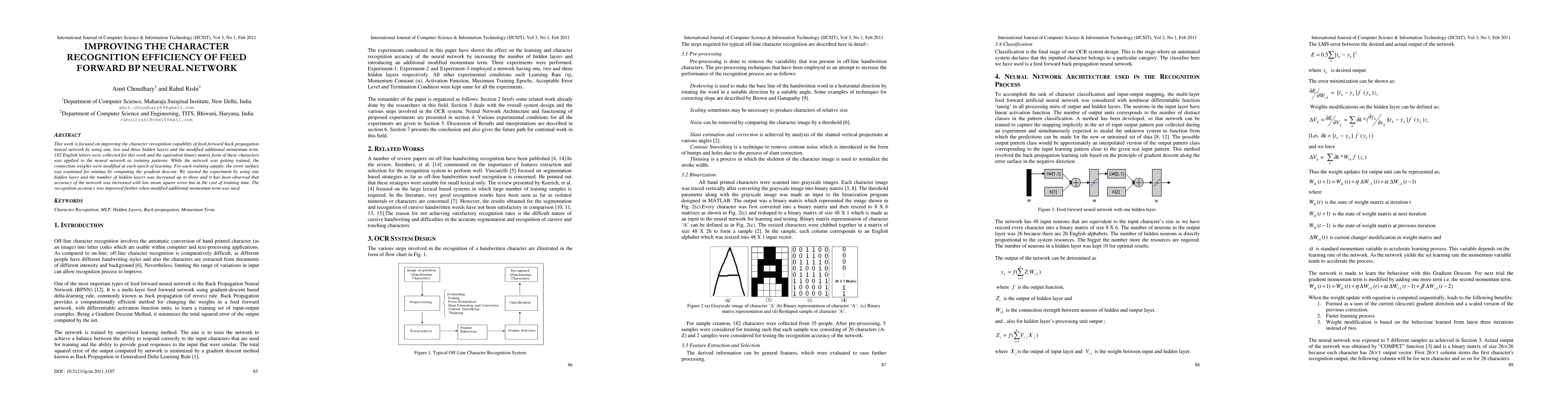 This work is focused on improving the character recognition capability of feed-forward back-propagation neural network by using one, two and three hidden layers and the modified additional momentum term. 182 English letters were collected for this work and the equivalent binary matrix form of these characters was applied to the neural network as training patterns. While the network was getting trained, the connection weights were modified at each epoch of learning. For each training sample, the error surface was examined for minima by computing the gradient descent. We started the experiment by using one hidden layer and the number of hidden layers was increased up to three and it has been observed that accuracy of the network was increased with low mean square error but at the cost of training time. The recognition accuracy was improved further when modified additional momentum term was used.