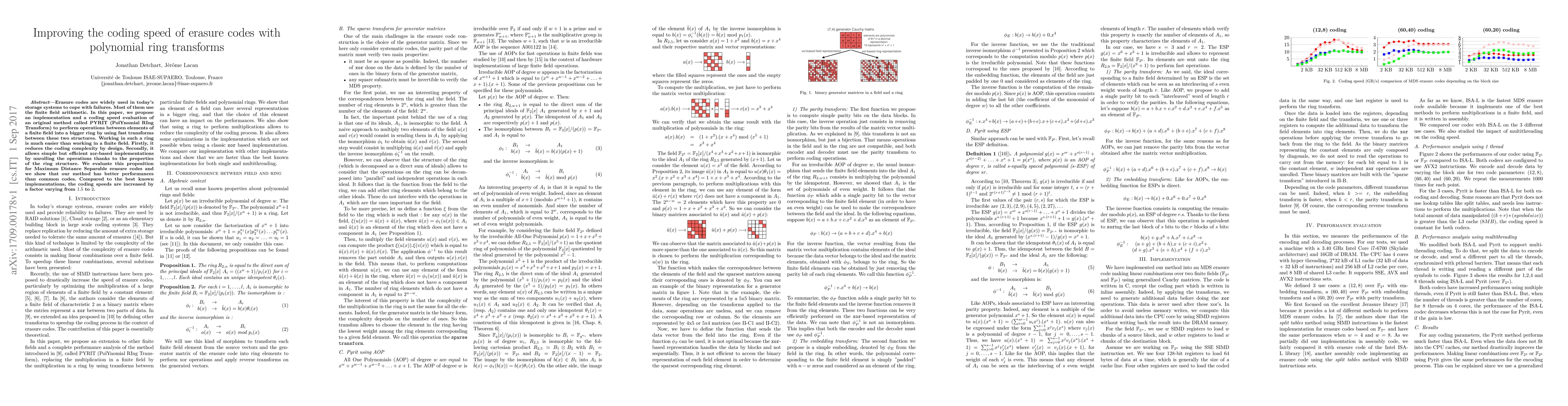 Erasure codes are widely used in today's storage systems to cope with failures. Most of them use the finite field arithmetic. In this paper, we propose an implementation and a coding speed evaluation of an original method called PYRIT (PolYnomial RIng Transform) to perform operations between elements of a finite field into a bigger ring by using fast transforms between these two structures. Working in such a ring is much easier than working in a finite field. Firstly, it reduces the coding complexity by design. Secondly, it allows simple but efficient \texttt{xor}-based implementations by unrolling the operations thanks to the properties of the ring structure. We evaluate this proposition for Maximum Distance Separable erasure codes and we show that our method has better performances than common codes. Compared to the best known implementations, the coding speeds are increased by a factor varying from $1.5$ to $2$.