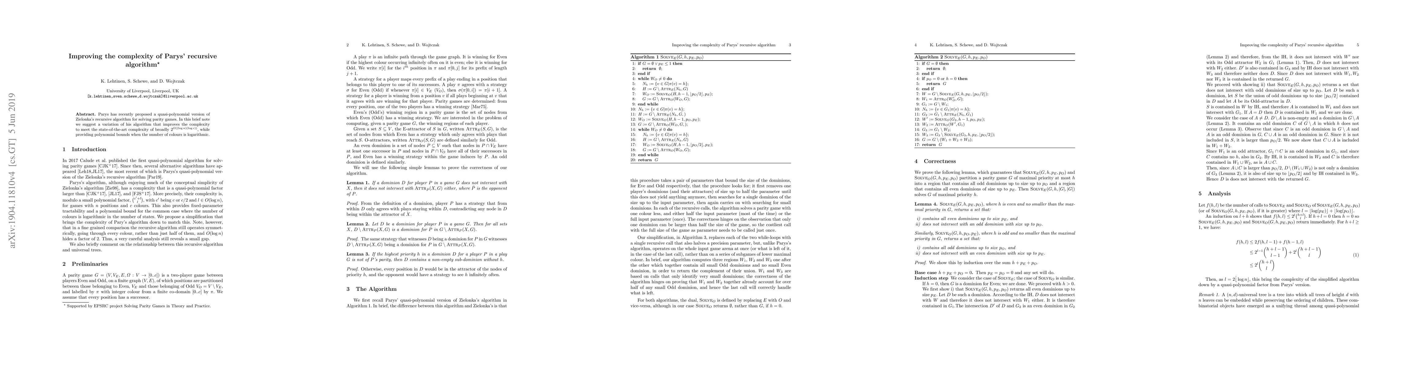 Researchers improved Parys' quasi-polynomial algorithm for solving parity games to achieve state-of-the-art complexity $2^{O(( ext{log} n)( ext{log} c))}$, offering polynomial bounds when colors are logarithmic.