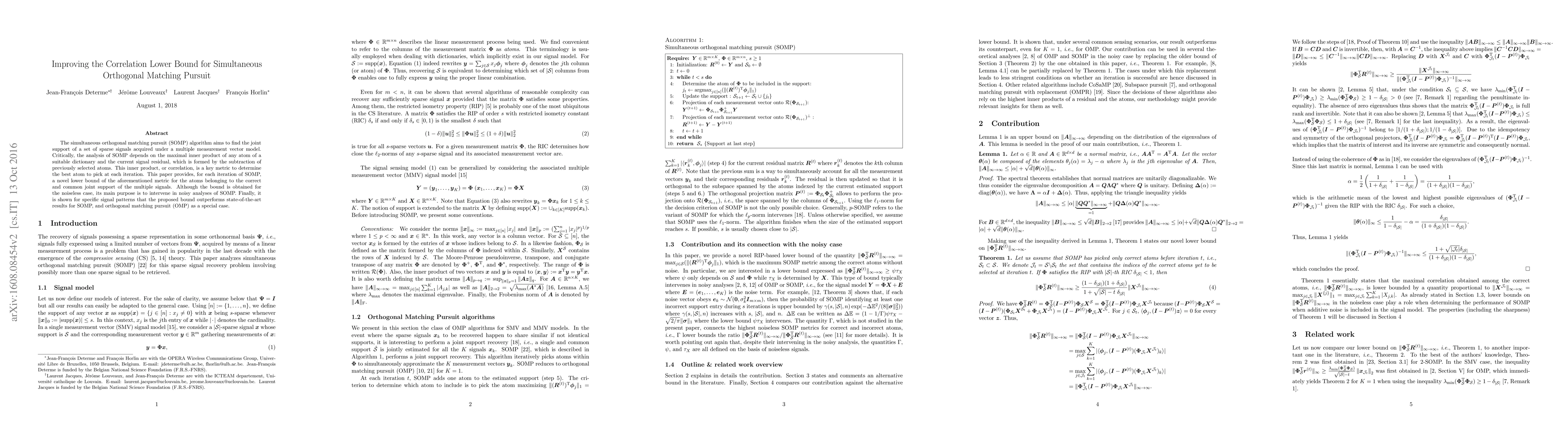 This paper introduces a new lower bound for the correlation metric in the simultaneous orthogonal matching pursuit (SOMP) algorithm, enhancing the analysis of SOMP in noisy environments. The proposed bound outperforms existing state-of-the-art results for both SOMP and orthogonal matching pursuit (OMP).