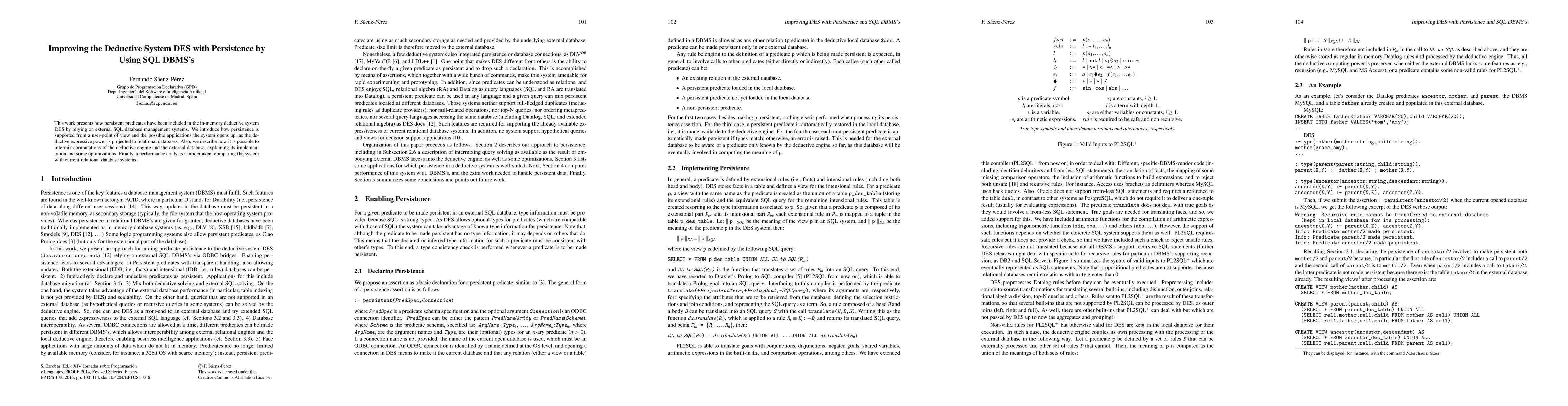 This work presents how persistent predicates have been included in the in-memory deductive system DES by relying on external SQL database management systems. We introduce how persistence is supported from a user-point of view and the possible applications the system opens up, as the deductive expressive power is projected to relational databases. Also, we describe how it is possible to intermix computations of the deductive engine and the external database, explaining its implementation and some optimizations. Finally, a performance analysis is undertaken, comparing the system with current relational database systems.