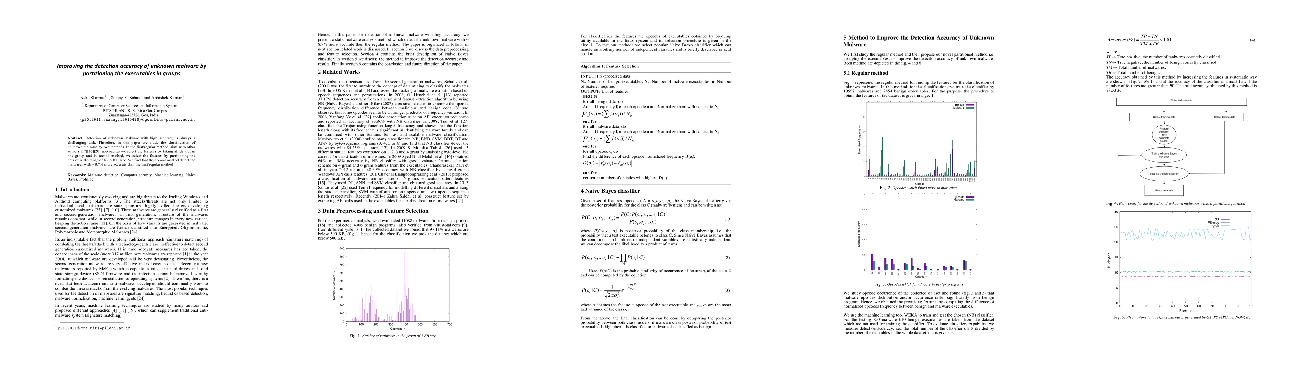 Detection of unknown malware with high accuracy is always a challenging task. Therefore, in this paper, we study the classification of unknown malware by two methods. In the first/regular method, similar to other authors [17][16][20] approaches we select the features by taking all dataset in one group and in the second method, we select the features by partitioning the dataset in the range of file 5 KB size. We find that the second method to detect the malware with ~8.7% more accurate than the first/regular method.