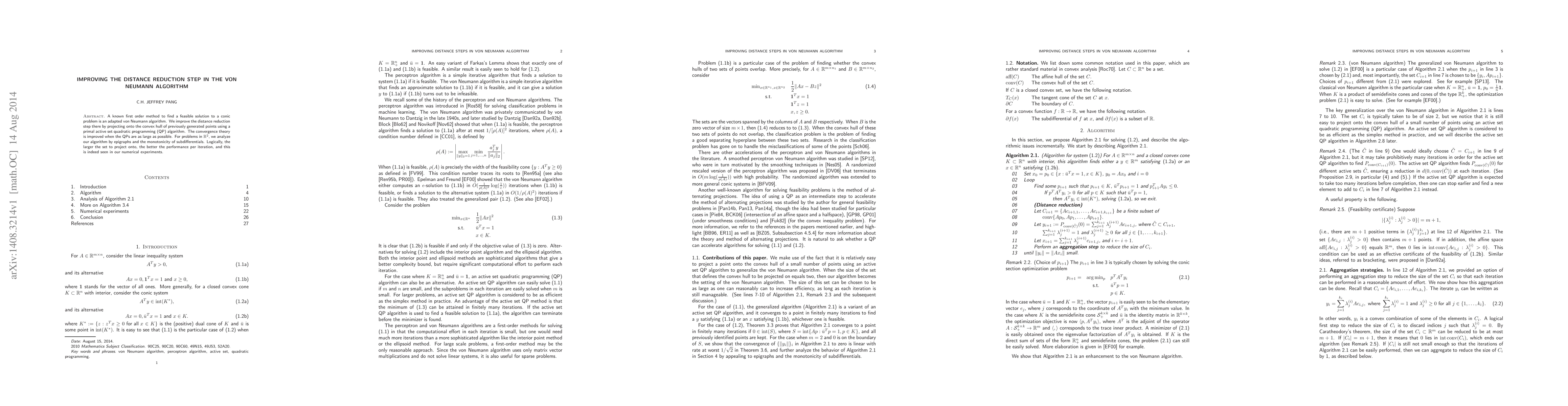 A known first order method to find a feasible solution to a conic problem is an adapted von Neumann algorithm. We improve the distance reduction step there by projecting onto the convex hull of previously generated points using a primal active set quadratic programming (QP) algorithm. The convergence theory is improved when the QPs are as large as possible. For problems in R^2, we analyze our algorithm by epigraphs and the monotonicity of subdifferentials. Logically, the larger the set to project onto, the better the performance per iteration, and this is indeed seen in our numerical experiments.
