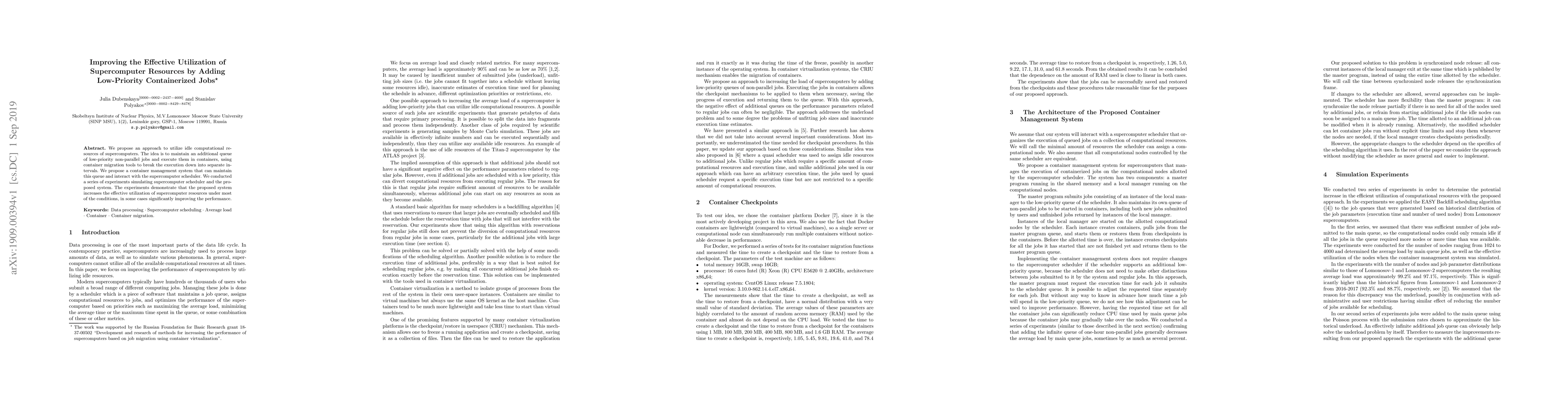Researchers propose a system to utilize idle supercomputer resources by executing low-priority jobs in containers, increasing effective utilization under most conditions.