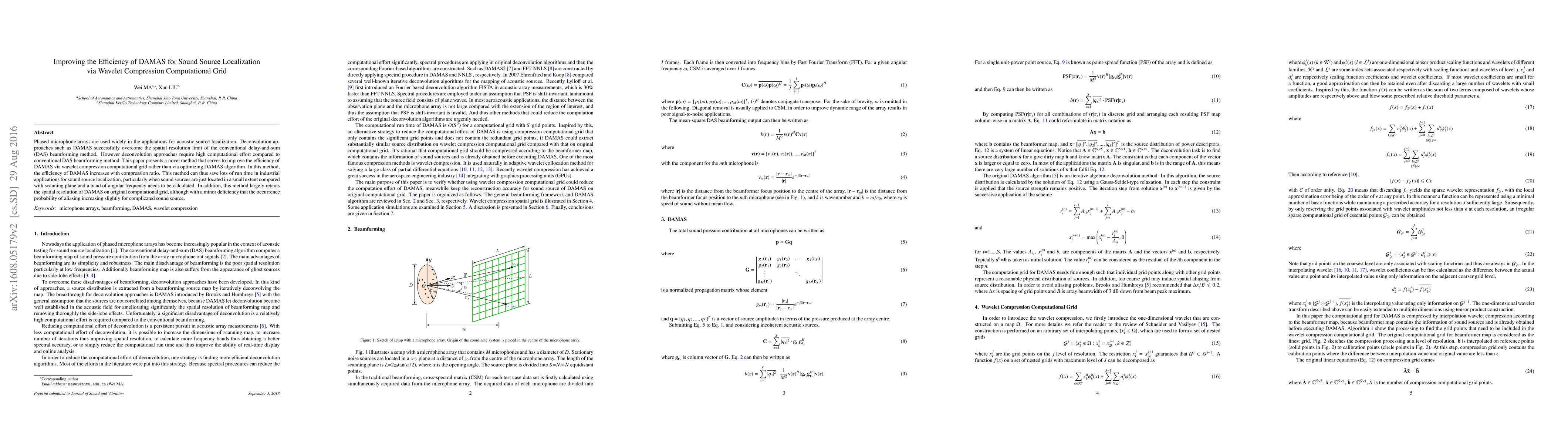 Phased microphone arrays are used widely in the applications for acoustic source localization. Deconvolution approaches such as DAMAS successfully overcome the spatial resolution limit of the conventional delay-and-sum (DAS) beamforming method. However deconvolution approaches require high computational effort compared to conventional DAS beamforming method. This paper presents a novel method that serves to improve the efficiency of DAMAS via wavelet compression computational grid rather than via optimizing DAMAS algorithm. In this method, the efficiency of DAMAS increases with compression ratio. This method can thus save lots of run time in industrial applications for sound source localization, particularly when sound sources are just located in a small extent compared with scanning plane and a band of angular frequency needs to be calculated. In addition, this method largely retains the spatial resolution of DAMAS on original computational grid, although with a minor deficiency that the occurrence probability of aliasing increasing slightly for complicated sound source.
