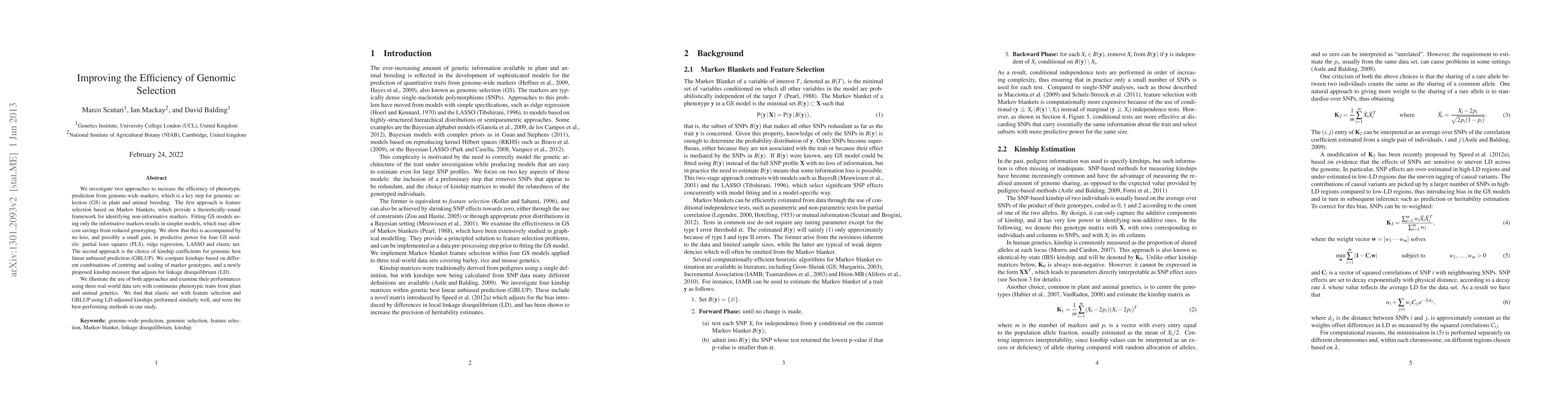 This research explores two methods to enhance genomic selection efficiency. First, using Markov blankets for feature selection simplifies genome-wide marker models without losing predictive power. Second, employing linkage disequilibrium (LD)-adjusted kinship in genomic best linear unbiased prediction (GBLUP) improves performance. Both methods were most effective in elastic net and GBLUP, as demonstrated through real-world plant and animal genetics data sets.