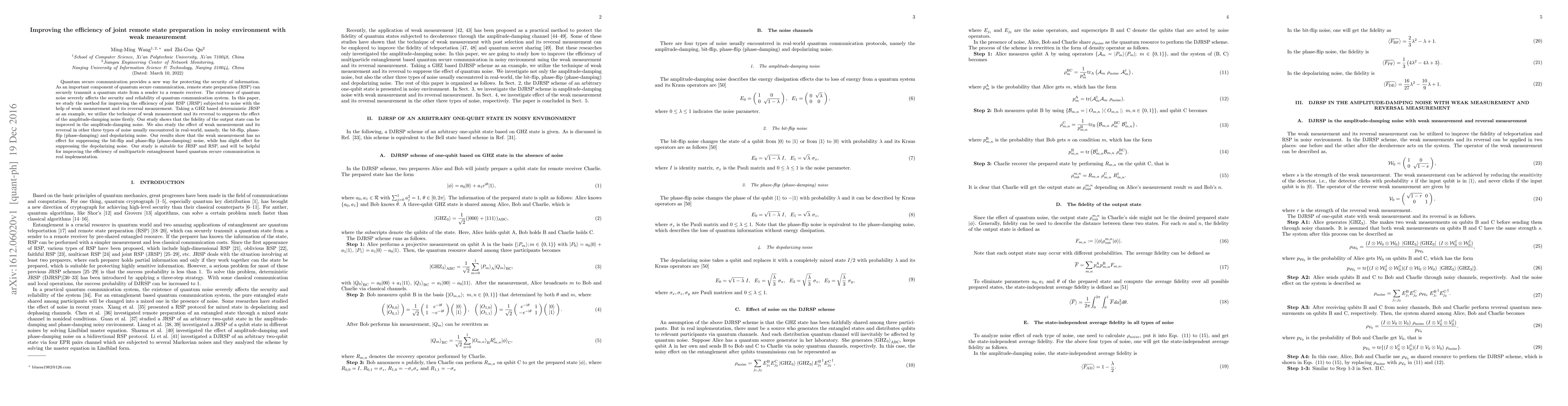 Quantum secure communication provides a new way for protecting the security of information. As an important component of quantum secure communication, remote state preparation (RSP) can securely transmit a quantum state from a sender to a remote receiver. The existence of quantum noise severely affects the security and reliability of quantum communication system. In this paper, we study the method for improving the efficiency of joint RSP (JRSP) subjected to noise with the help of weak measurement and its reversal measurement. Taking a GHZ based deterministic JRSP as an example, we utilize the technique of weak measurement and its reversal to suppress the effect of the amplitude-damping noise firstly. Our study shows that the fidelity of the output state can be improved in the amplitude-damping noise. We also study the effect of weak measurement and its reversal in other three types of noise usually encountered in real-world, namely, the bit-flip, phase-flip (phase-damping) and depolarizing noise. Our results show that the weak measurement has no effect for suppressing the bit-flip and phase-flip (phase-damping) noise, while has slight effect for suppressing the depolarizing noise. Our study is suitable for JRSP and RSP, and will be helpful for improving the efficiency of multiparticle entanglement based quantum secure communication in real implementation.