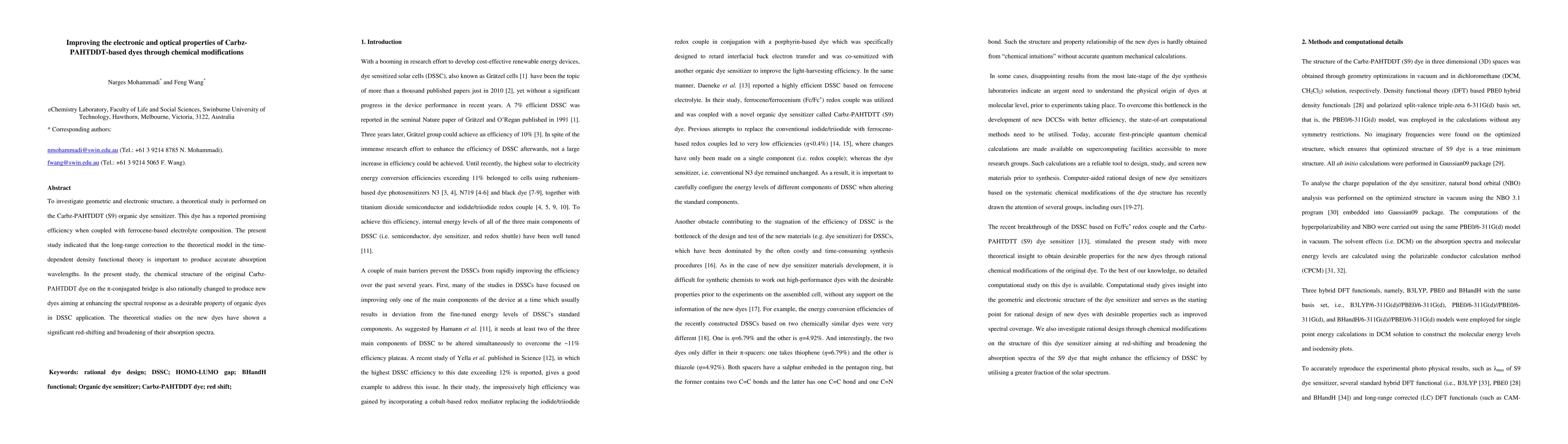 To investigate geometric and electronic structure, a theoretical study is performed on the Carbz-PAHTDDT (S9) organic dye sensitizer. This dye has a reported promising efficiency when coupled with ferrocene-based electrolyte composition. The present study indicated that the long-range correction to the theoretical model in the time-dependent density functional theory is important to produce accurate absorption wavelengths. In the present study, the chemical structure of the original Carbz-PAHTDDT dye on the {\pi}-conjugated bridge is also rationally changed to produce new dyes aiming at enhancing the spectral response as a desirable property of organic dyes in DSSC application. The theoretical studies on the new dyes have shown a significant red-shifting and broadening of their absorption spectra.