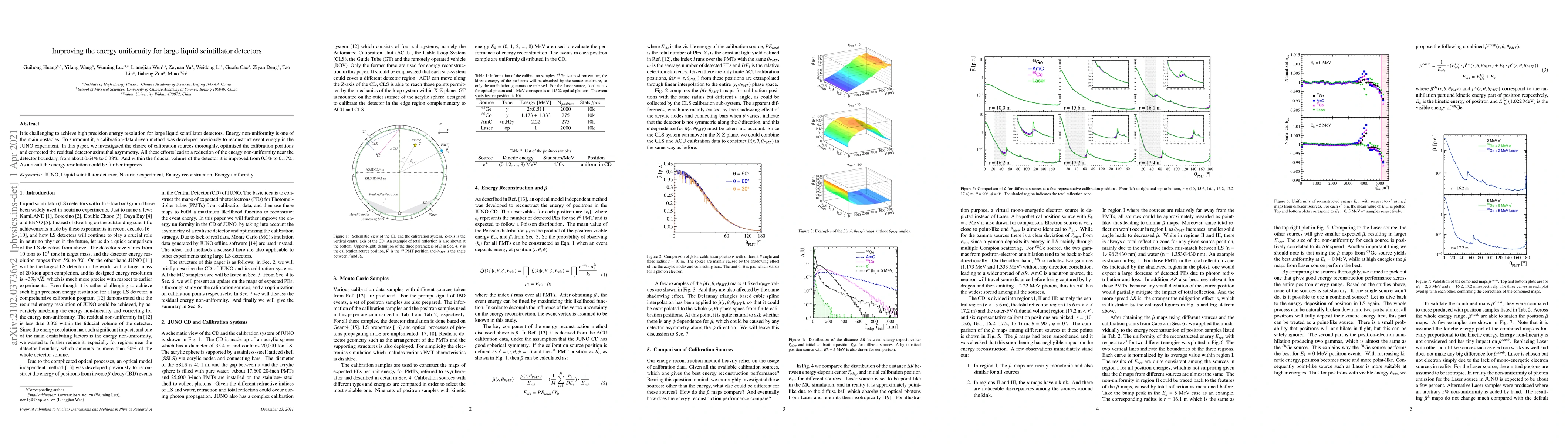This paper details improvements to the energy uniformity in large liquid scintillator detectors, focusing on reducing energy non-uniformity through calibration source optimization, position adjustment, and correction of detector asymmetry. The efforts resulted in significant reductions in non-uniformity, enhancing the overall energy resolution.