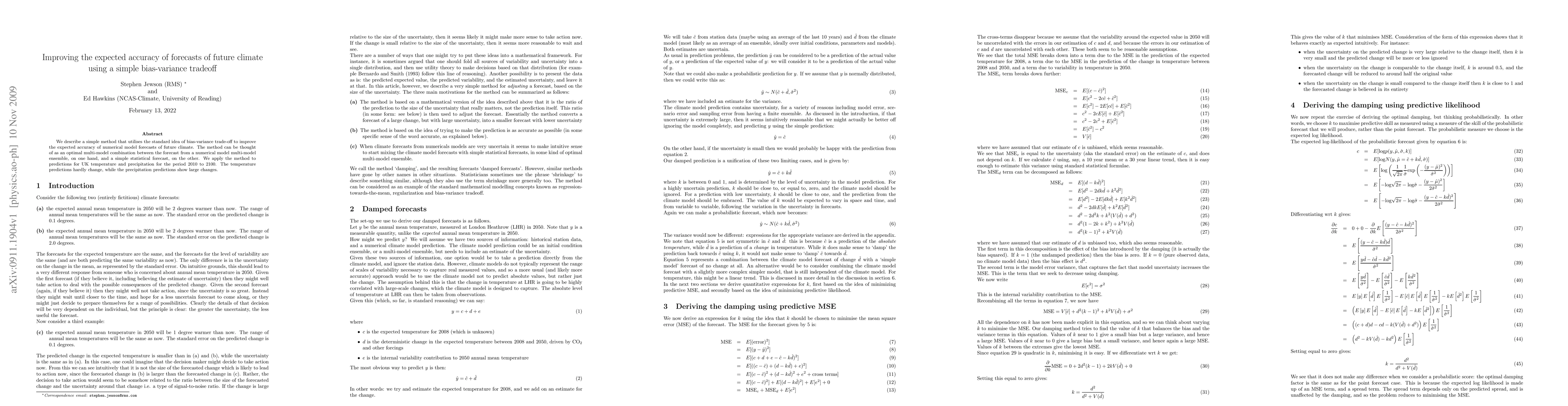We describe a simple method that utilises the standard idea of bias-variance trade-off to improve the expected accuracy of numerical model forecasts of future climate. The method can be thought of as an optimal multi-model combination between the forecast from a numerical model multi-model ensemble, on one hand, and a simple statistical forecast, on the other. We apply the method to predictions for UK temperature and precipitation for the period 2010 to 2100. The temperature predictions hardly change, while the precipitation predictions show large changes.