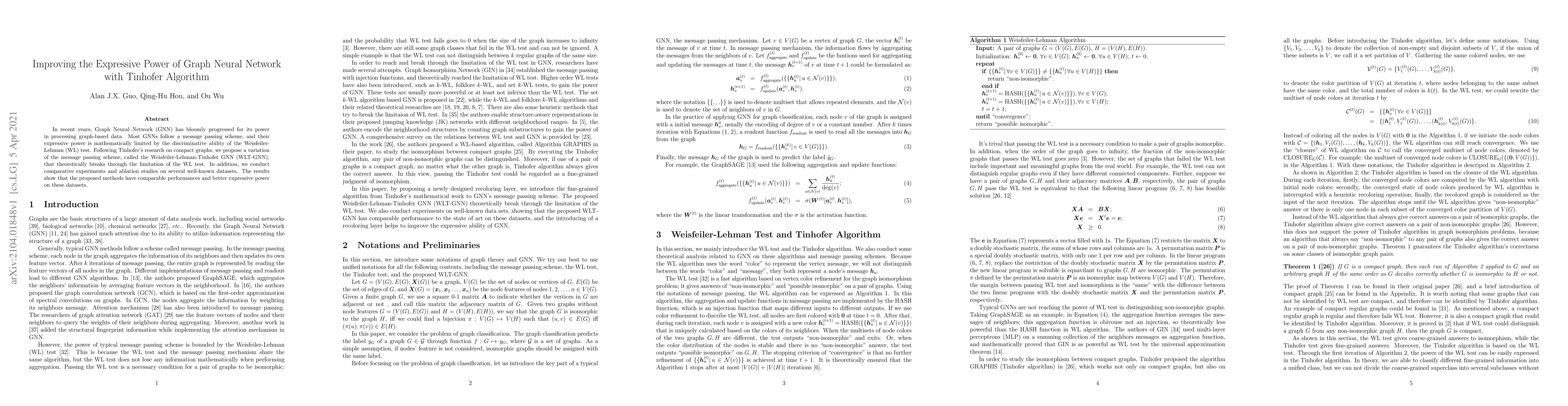 This paper proposes a new Graph Neural Network (GNN) variant, the Weisfeiler-Lehman-Tinhofer GNN (WLT-GNN), which enhances expressive power by overcoming the limitations of the Weisfeiler-Lehman test. Experimental results demonstrate that WLT-GNN performs competitively and shows superior expressive power on various datasets.
