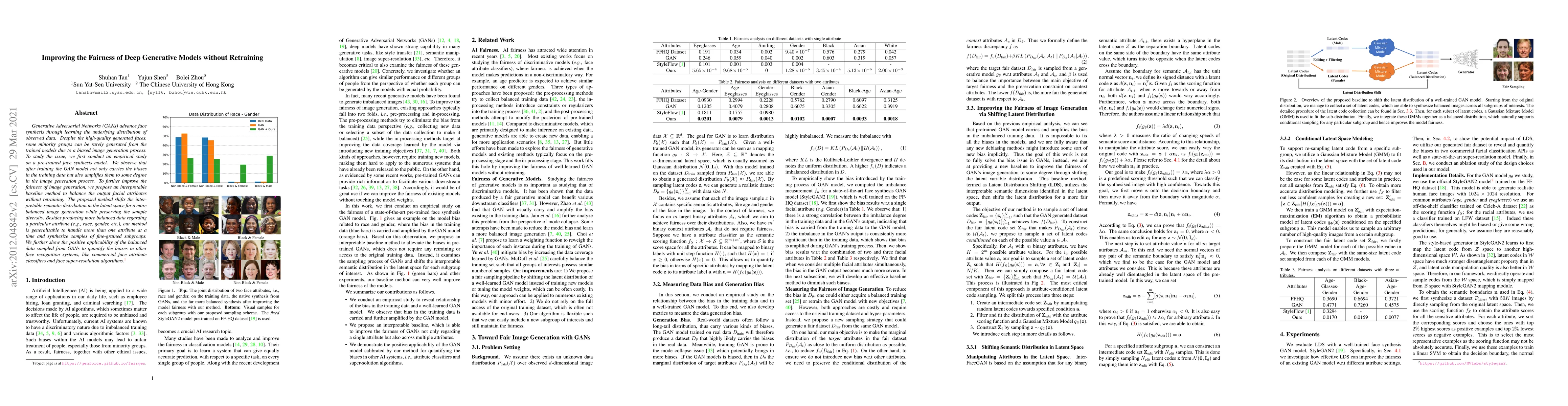 A new method improves fairness in deep generative models like GANs without retraining, producing more balanced data for minority groups and generalizable to multiple attributes. The approach enhances face synthesis while preserving diversity and can be used to quantify biases in other facial recognition systems.