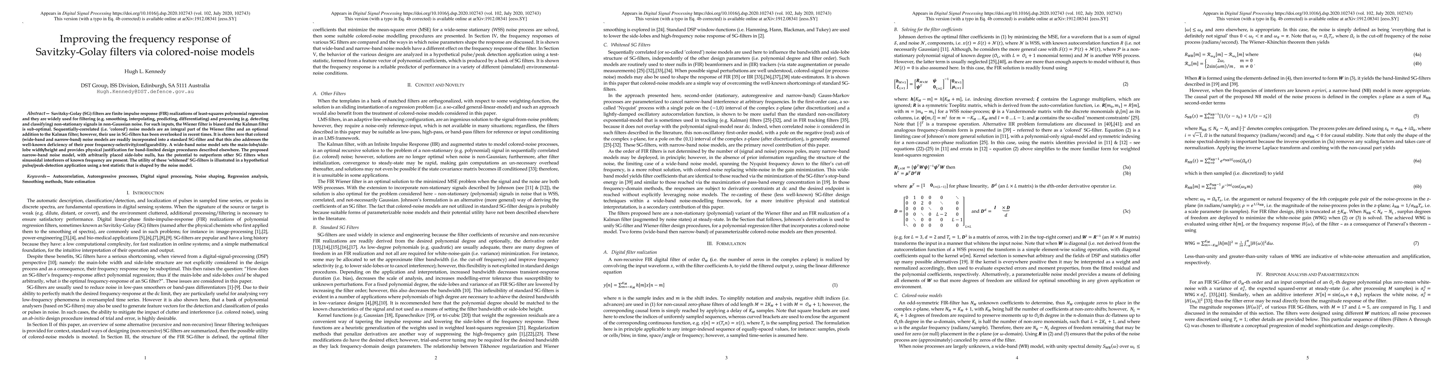 This paper proposes incorporating colored-noise models into Savitzky-Golay filters to enhance their frequency response, addressing their known frequency-selectivity issues. The approach includes both wide-band and narrow-band noise models, potentially improving performance in detecting sinusoidal signals.