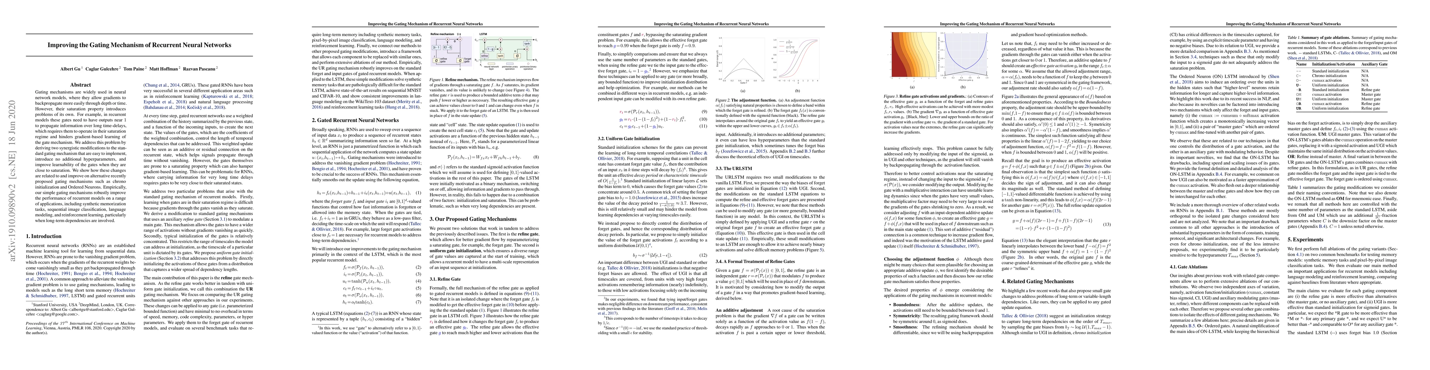 This paper proposes two modifications to the standard gating mechanism in recurrent neural networks to enhance learnability near saturation, improving performance on tasks requiring long-term dependencies, such as language modeling and reinforcement learning. The changes are simple, require no additional hyperparameters, and outperform alternative gating mechanisms.